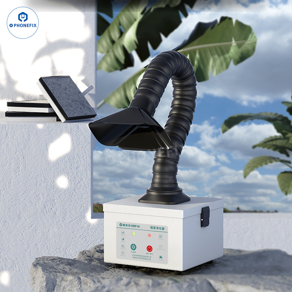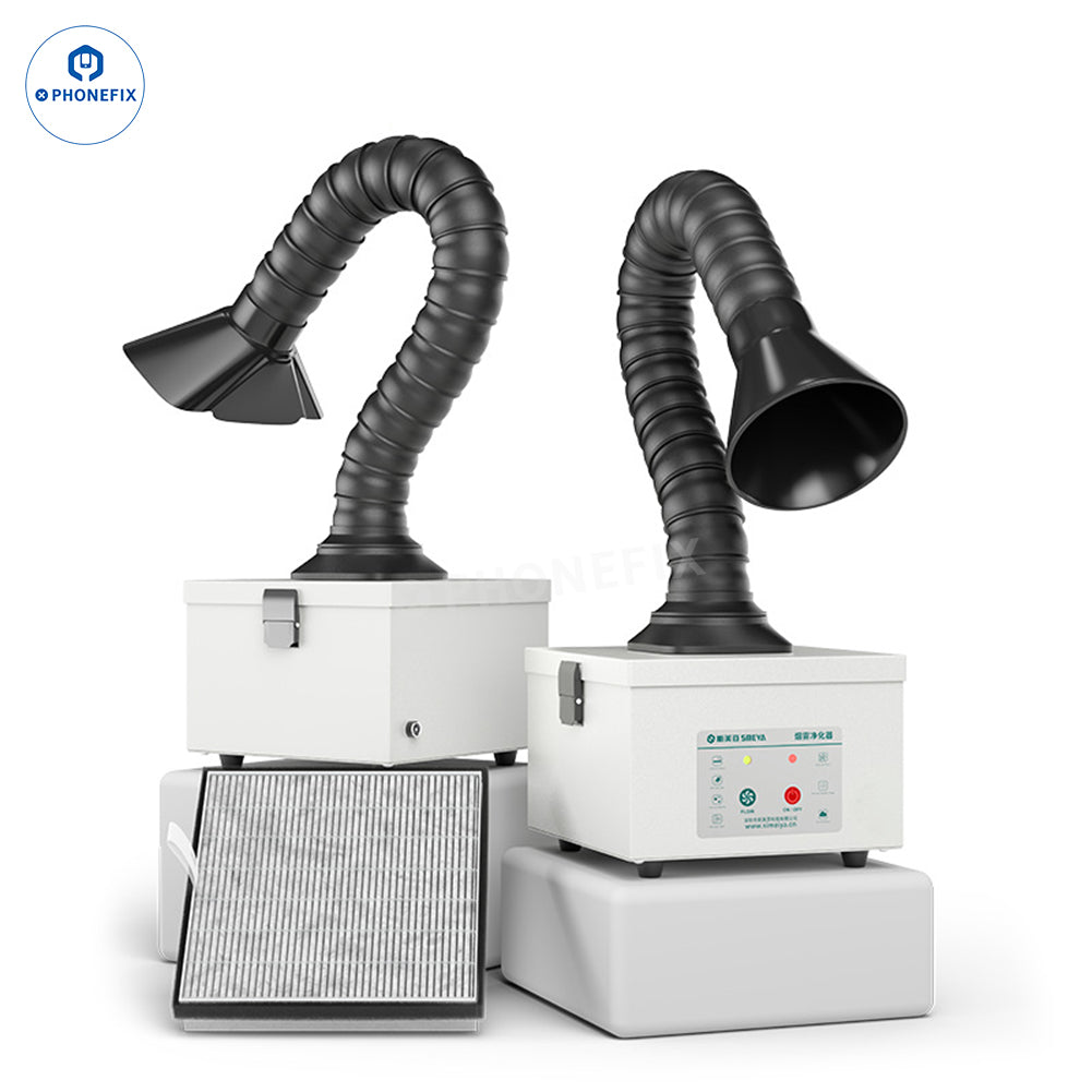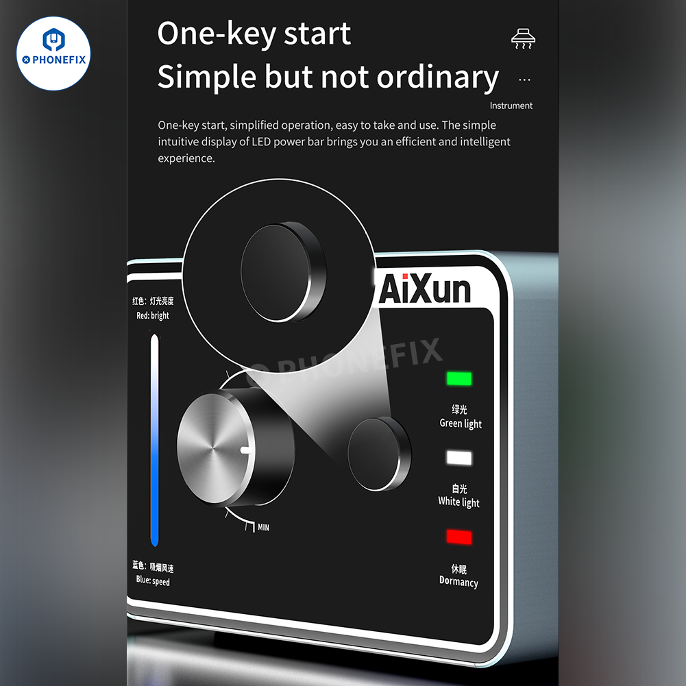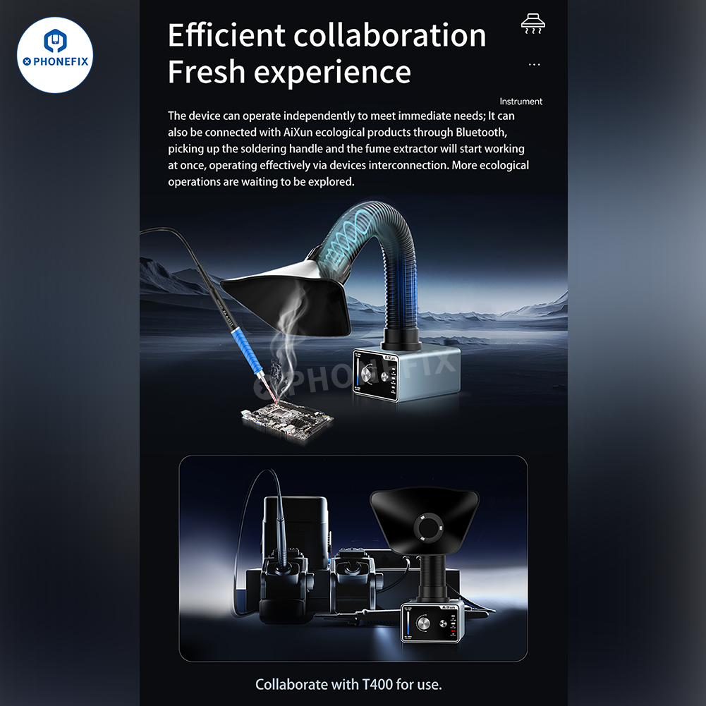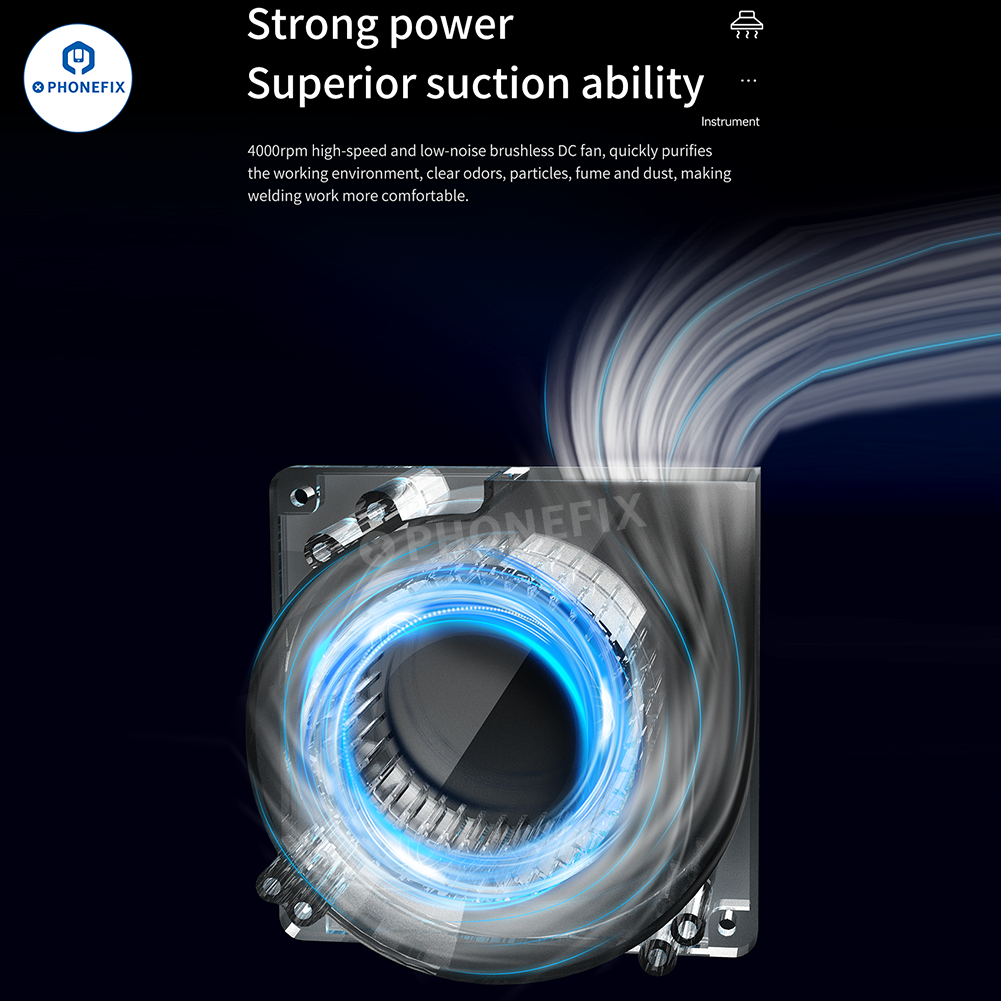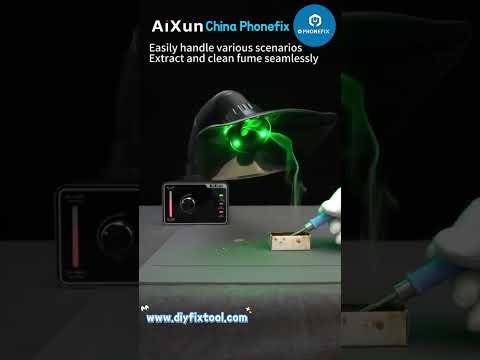 Aixun ES02 Desktop Fume Extractor with LED Light for Mobile Phone Electronics PCB Soldering Repair. AiXun ES02 intelligent smoke absorber with 4000rpm high-speed and low-noise brushless DC fan, one-key start, effectively removes odor, oil smoke, dust during BGA PCB CNC welding/desoldering repair.