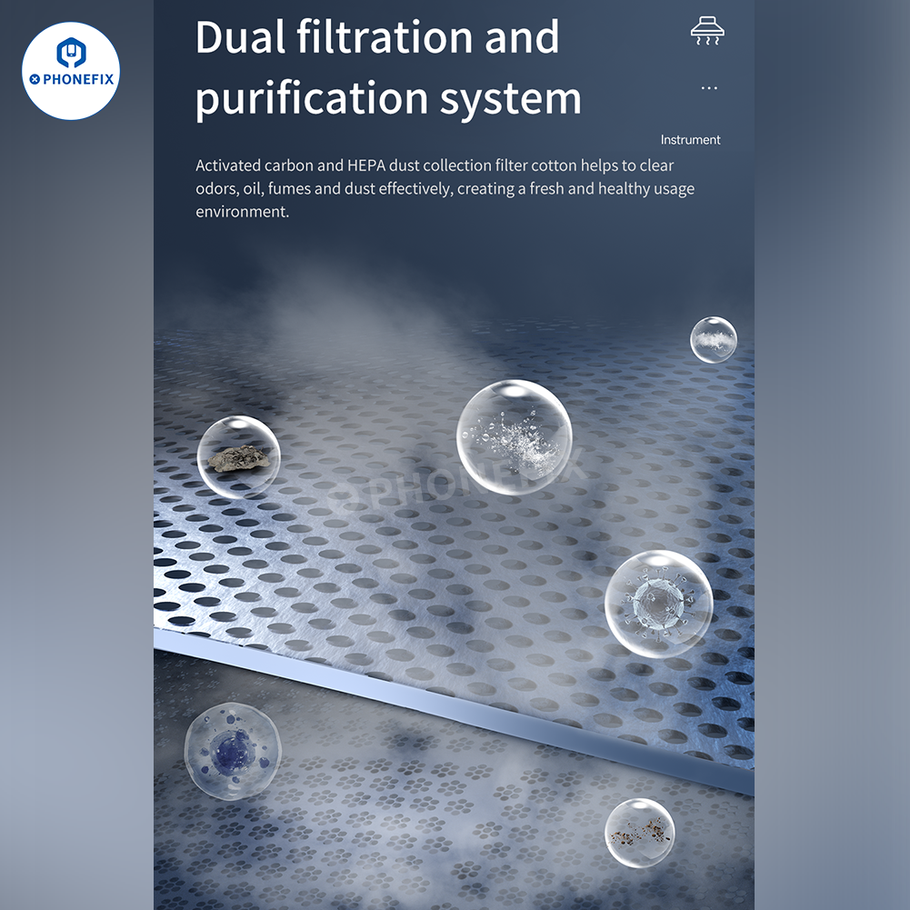 Dual Filtration System: Equipped with activated carbon and HEPA filters to remove odors, oil particles, fumes, and dust, providing a fresh workspace.