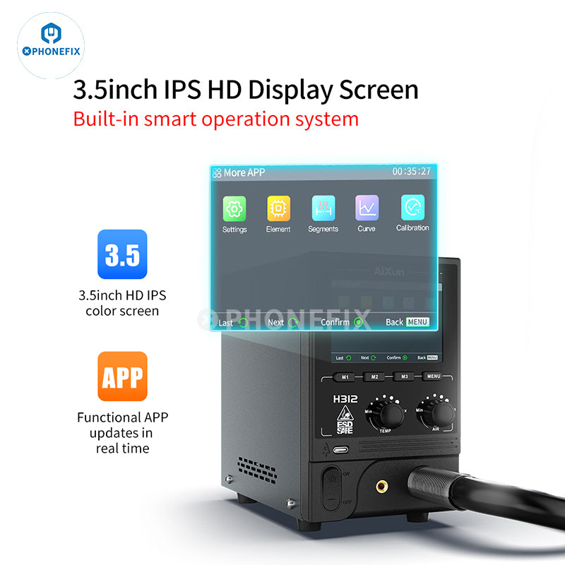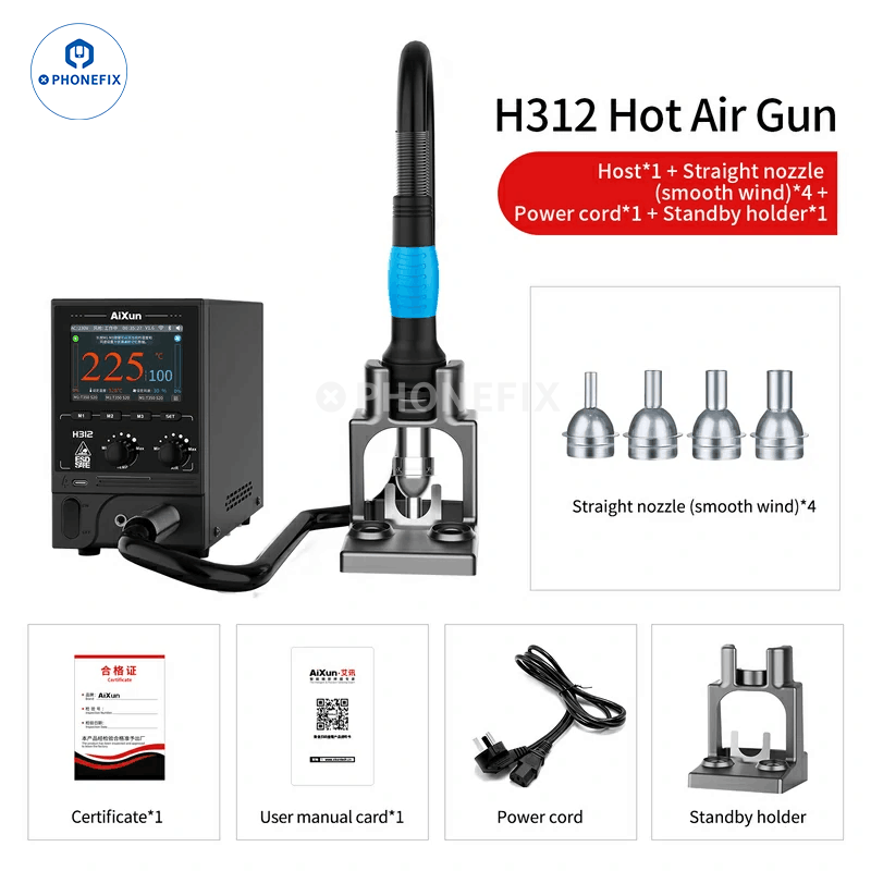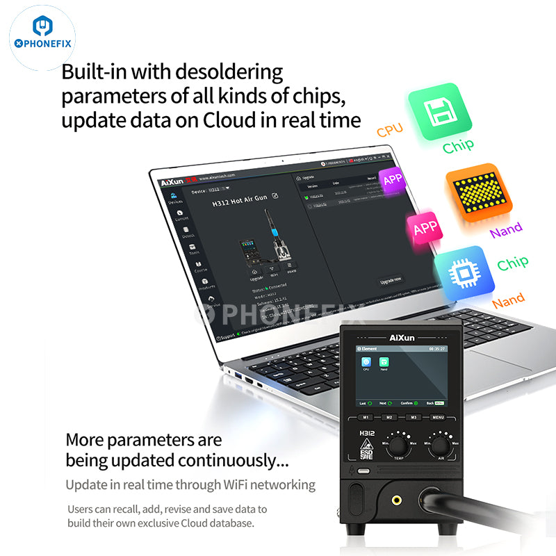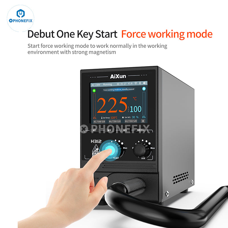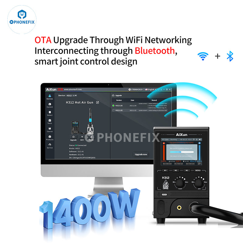 AiXun H312 Intelligent 1400W Hot Air Gun Networkable BGA Rework Station With Digital Display For Loic Board SMD BGA Chips Desoldering Soldering Repair. AiXun H312 hot air gun with internet technology WiFi networking OTA upgrade, interconnecting through bluetooth