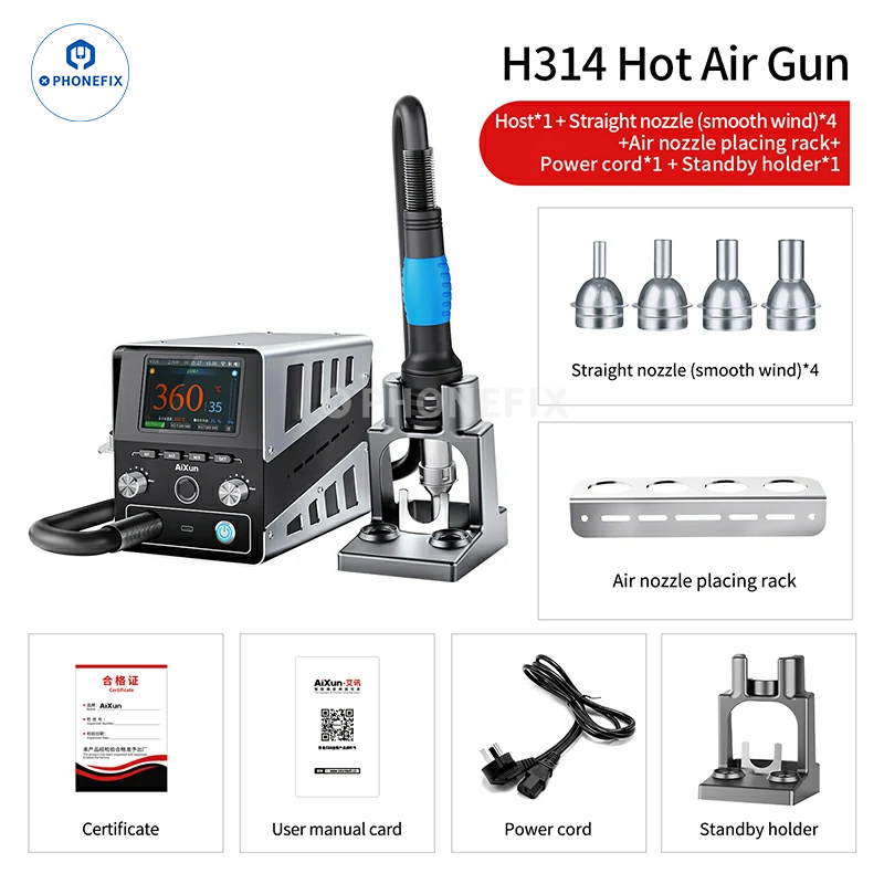 AiXun H314 1400W Smart Hot Air Gun Heating Intelligent Rework Station For Mobile Phone Tablets SMD BGA Repair. Aixun H314 intelligent digital hot air gun desoldering station has a rated power of 1400W, heat up to 380°C in 3 seconds, WiFi networking OTA upgrade, and supports AI intelligent voice central control to improve maintenance efficiency.