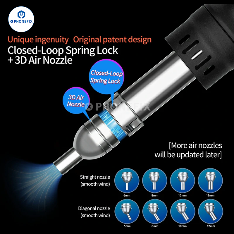 7. Hot Air nozzle adopts the patent design of spring lock, solving the problem that air nozzle swapping might be stuck under high temperature.