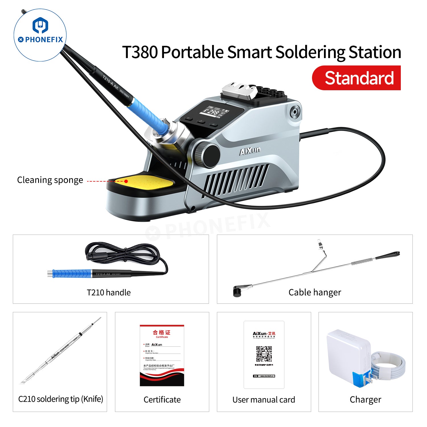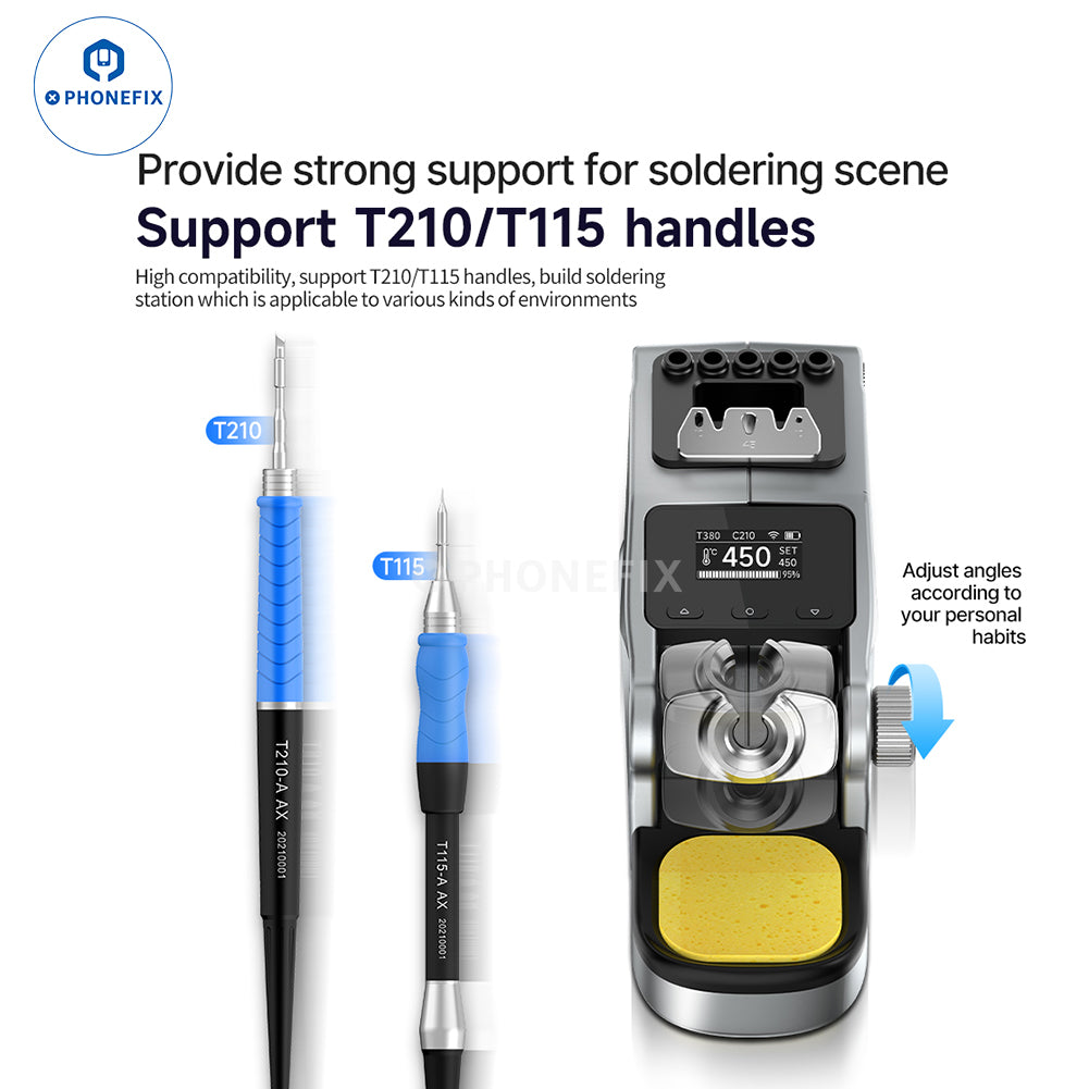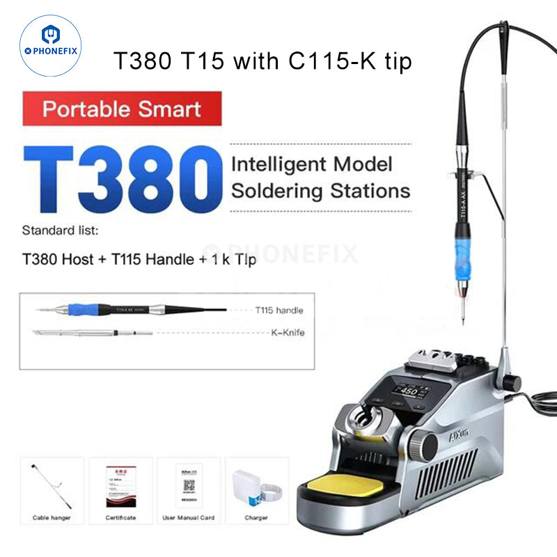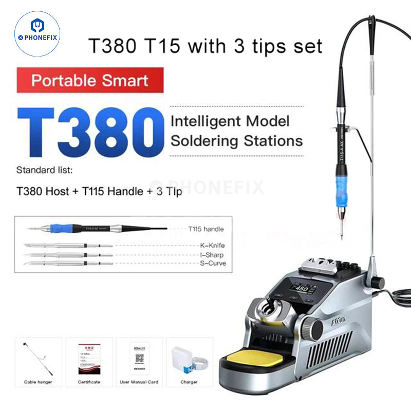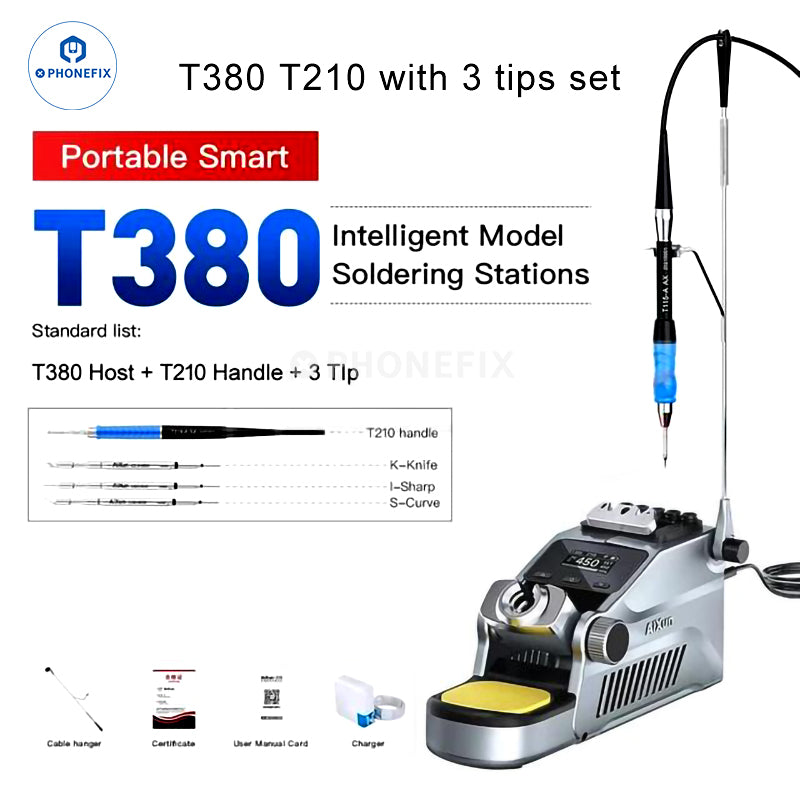 AIXUN T380 80W soldering station compatible with T210 T115 handle and supports C210 C115 soldering iron tips for mobile phone BGA PCB SMD CPU chips welding repair, quickly heat up and melt tin in 1 second. AIXUN T380 portable soldering station built-in a battery, type-c charging port, and supports PD/QC fast charging protocol.