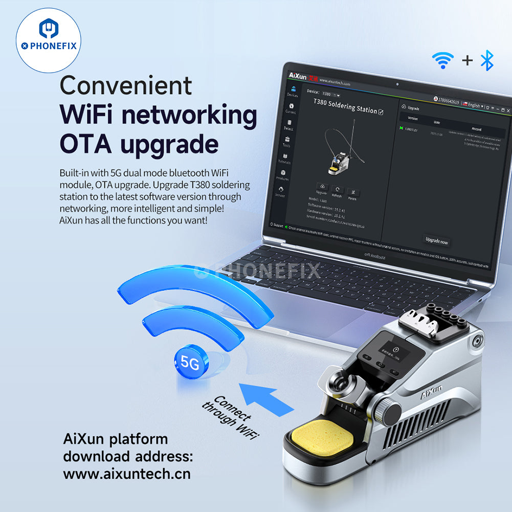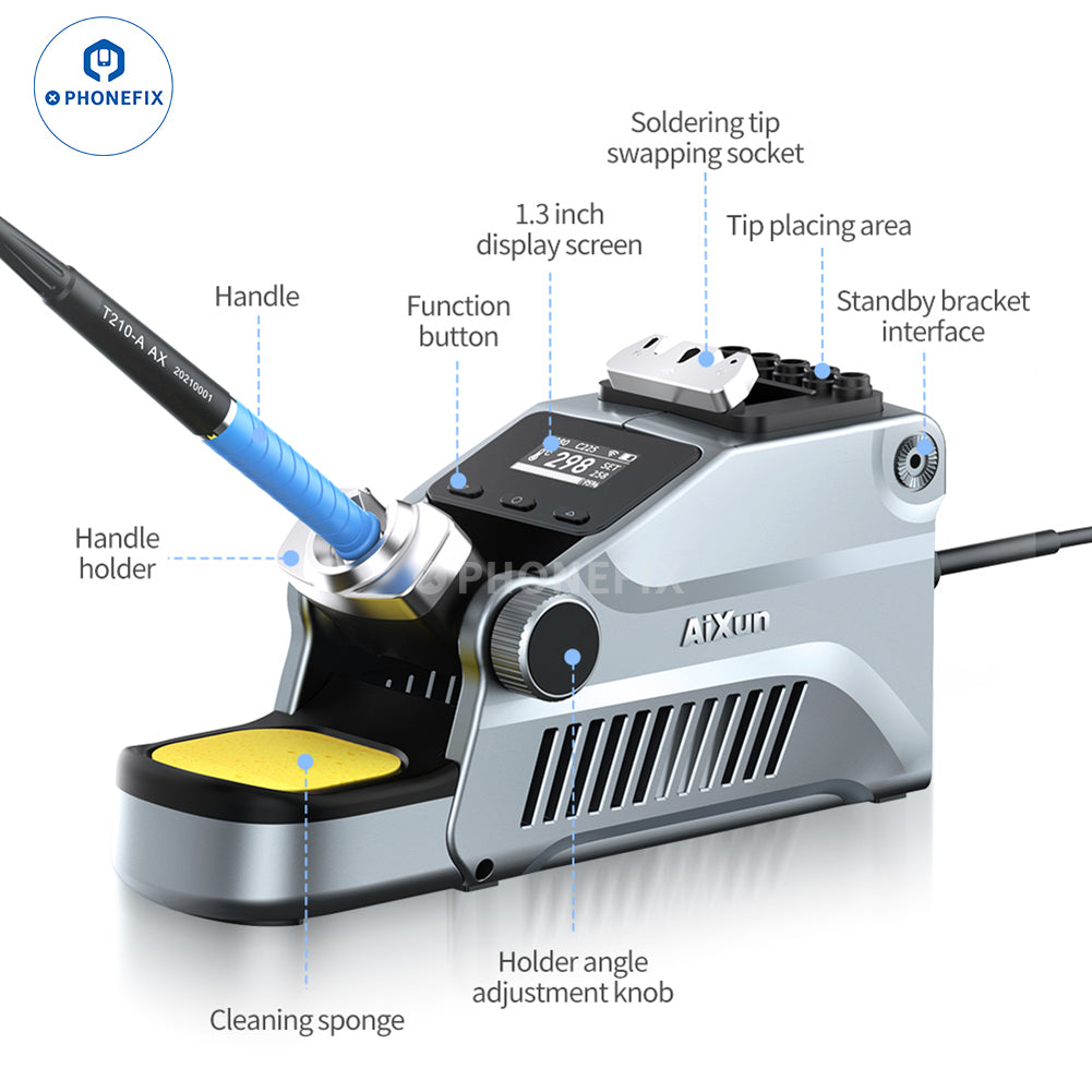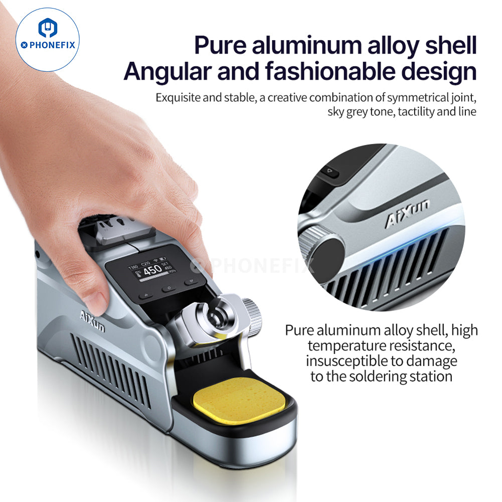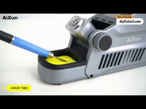 AIXUN T380 80W soldering station compatible with T210 T115 handle and supports C210 C115 soldering iron tips for mobile phone BGA PCB SMD CPU chips welding repair, quickly heat up and melt tin in 1 second. AIXUN T380 portable soldering station built-in a battery, type-c charging port, and supports PD/QC fast charging protocol.