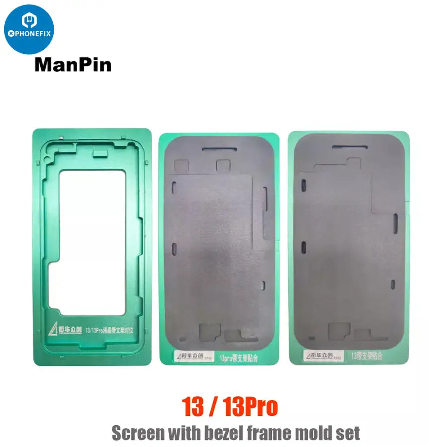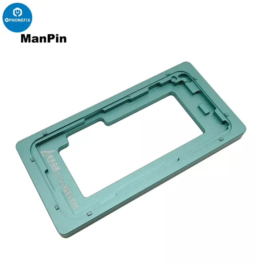 XHZC LCD alignment positioning mold with bezel frame For iPhone X/XS/11/12/13/14/15/16 series screen lamination repair. iPhone 11 12 13 14 15 16 Pro Max LCD screen alignment mold with bezel flex rubber pads for attaching the front screen glass to the bezel of the LCD display on the iPhone. Align the iPhone LCD screen with the glass lenses on the aluminum mold and press lightly to hold them together.