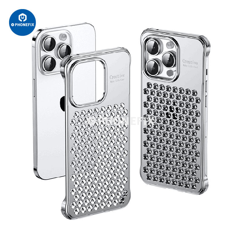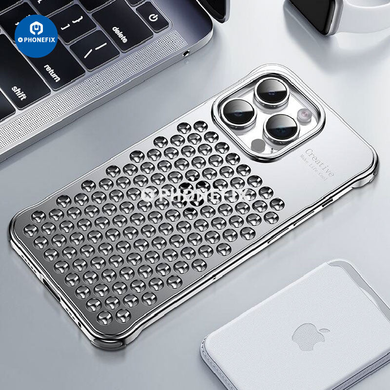 Anti-fall heat dissipation plating hole protector case for iPhone 14 -15 series phone case. metal honeycomb hole Anti-fall heat dissipation scratch-resistant phone case for iPhone 14/14Pro/14ProMax/15/15Pro/15ProMax.