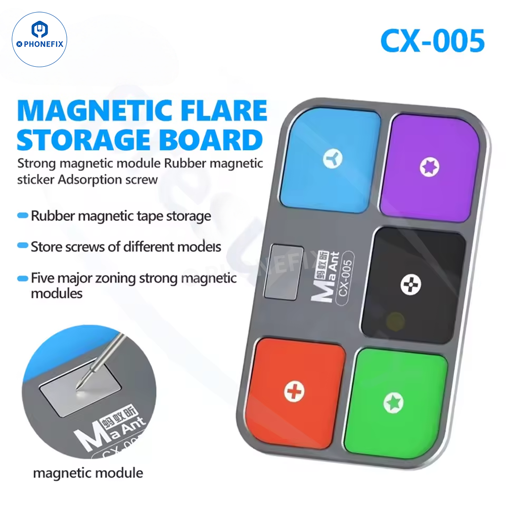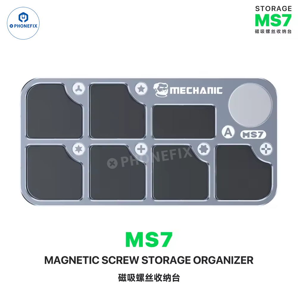 Universal Screw Magnetic Storage Mat for Mobile Phone Repair: MECHANIC MS7 Magnetic Screw Storage Organizer, Relife RL-091A Screw Magnetic Storage Tray, MaAnt CX-005 Screw Magnetic Storage Pad, 18 Kinds 7-Zone Alloy Magnetic Screw Absorption Mat, RF4 RF-MP21 Screw soft sorting and storage pad and LUBAN SST-1 Sector 9-Compartment Aluminum Alloy Screws Magnetic Storage Pad. 5-9 magnetic compartments are designed to hold different screw models, providing magnetic storage and effectively preventing screw loss. Suitable for storing screws from various electronic products, such as mobile phones, iPhones, iPads, tablets, computers, cameras, etc.