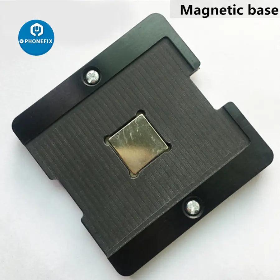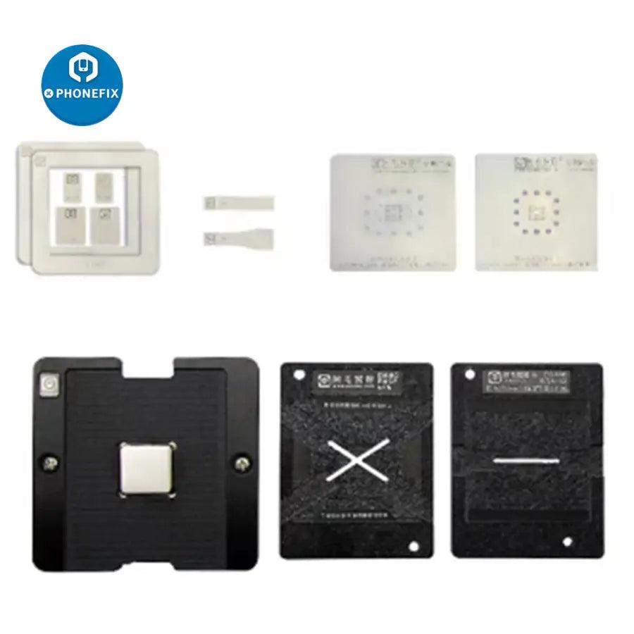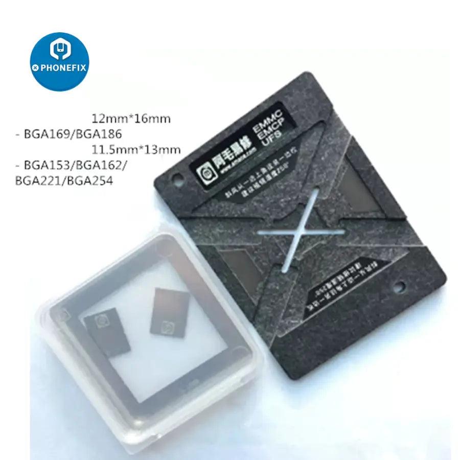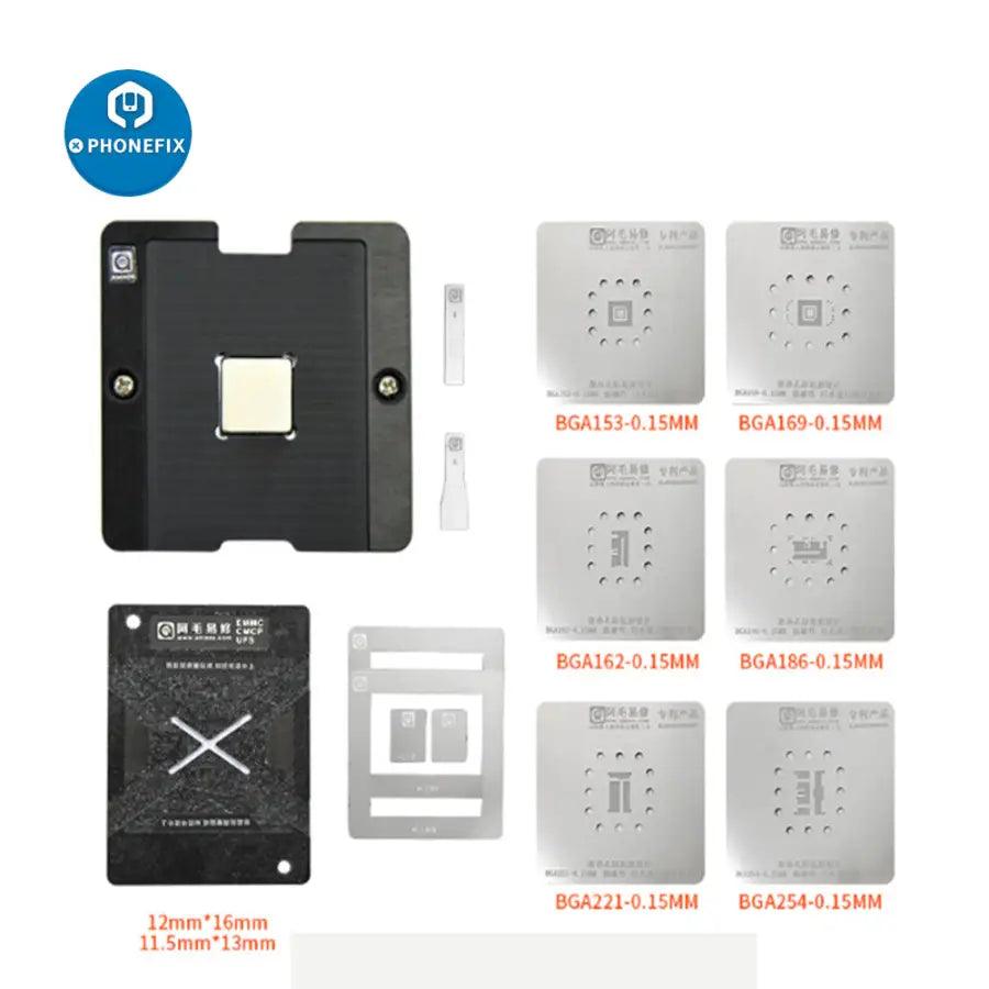 Amaoe Nand BGA reballing stencil pamphlet EMMC / EMCP / UFS positioning platform steel plate for nand rework tool kit, EMMC/EMCP/UFS positioning platform + adjustment steel plate, iPhone baseband CPU NAND BGA reballing tin net stencils with magnetic base positioning fixture, Amaoe EMMC EMCP UFS BGA Reballing Stencil for BGA153 BGA162 BGA169 BGA186 BGA221 BGA254 0.15mm Reballing Jig Platform