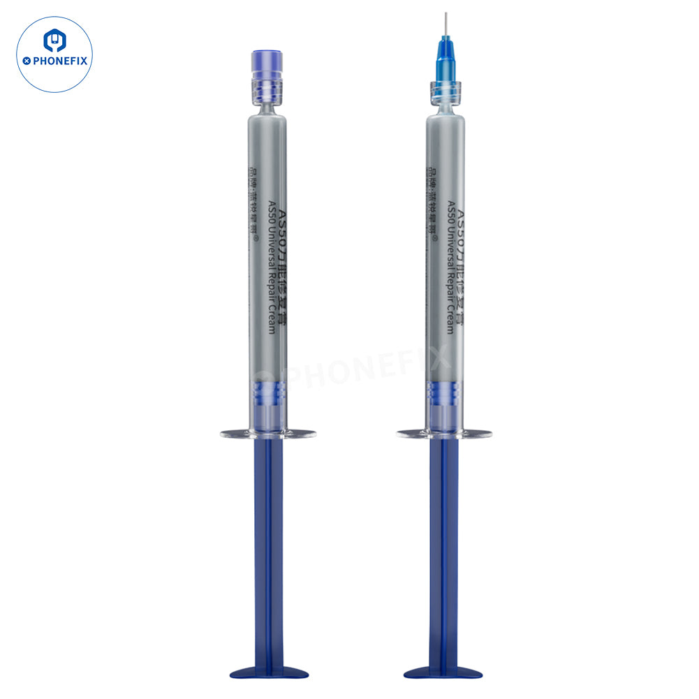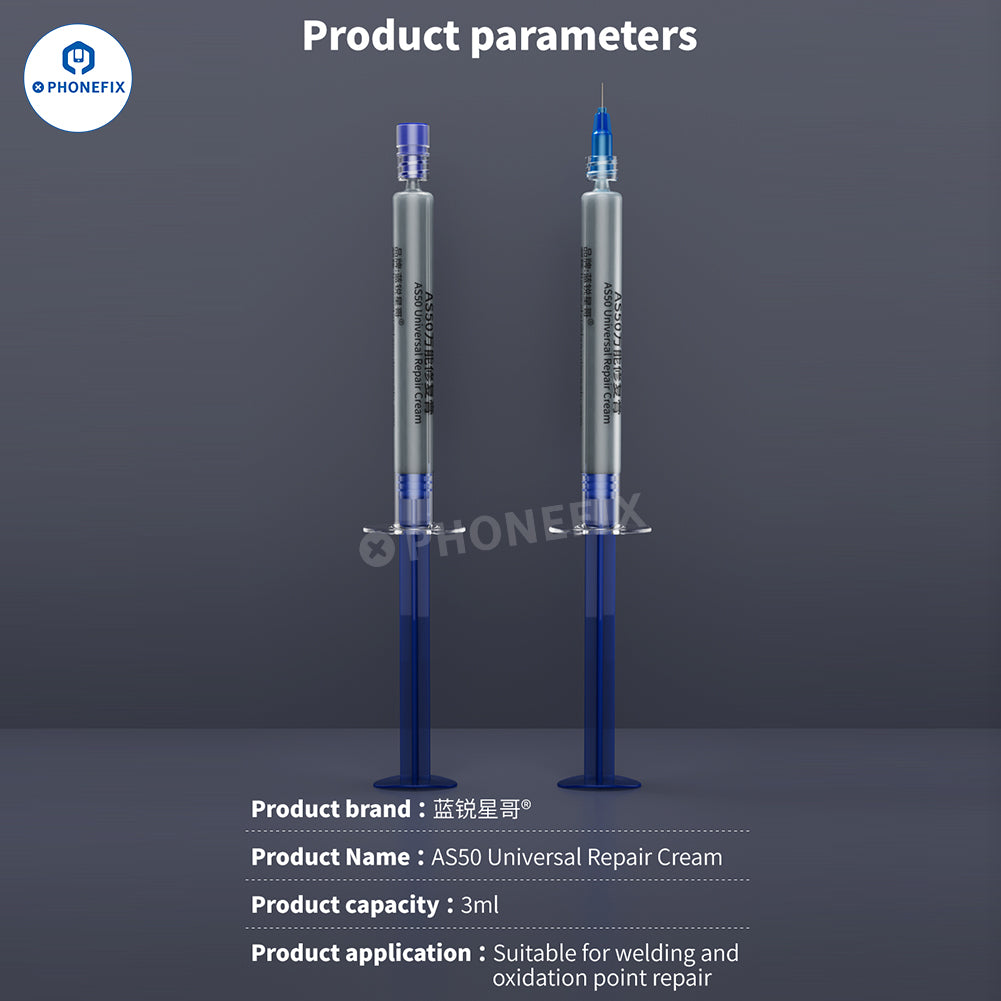 LANRUI AS50 Universal Repair Cream for Mobile Phone/iPhone motherboard oxidation spots removal, FPC connector soldering, shield cover welding, CPU tinning and detinning, etc. AS50 Solder Paste Cream used for PCB welding to remove oxidation marks, and improve the welding effect of screw columns and chips.