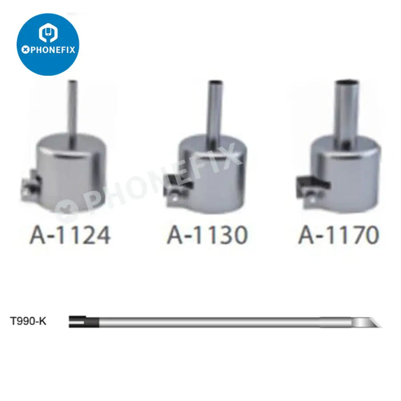 Hot air gun parameter: Power: 1300W(220V)/1000W(110V). Air volume: ≤120L/min. Temperature range: 100-500℃/202-932℉ Temperature Stability: 土2℃(Still Air, No Load). Standby function: Yes. Sleep function: Sleeps after 30 minutes of standby. (standby mode turned off,this function is also off). Quick function: 3 sets. Handle model: SP-102E(110V), SP-202E(220V). Air nozzle(standard): A1124, A1130, A1170.