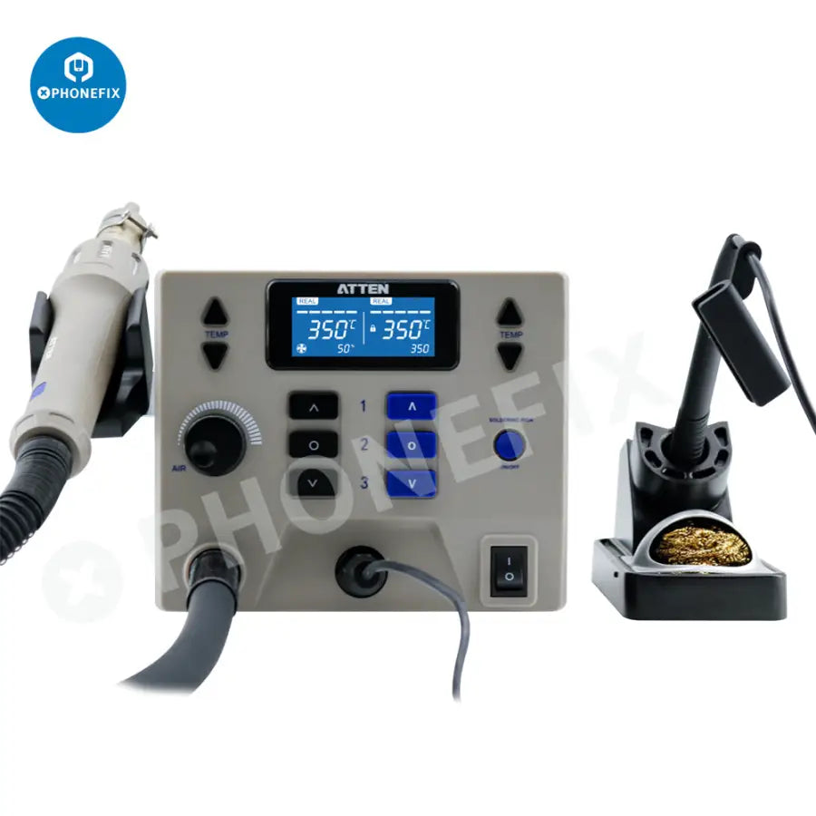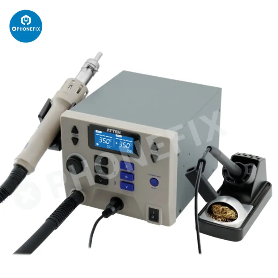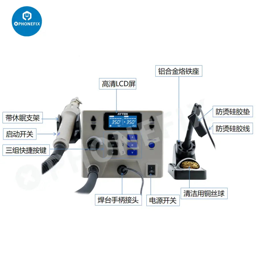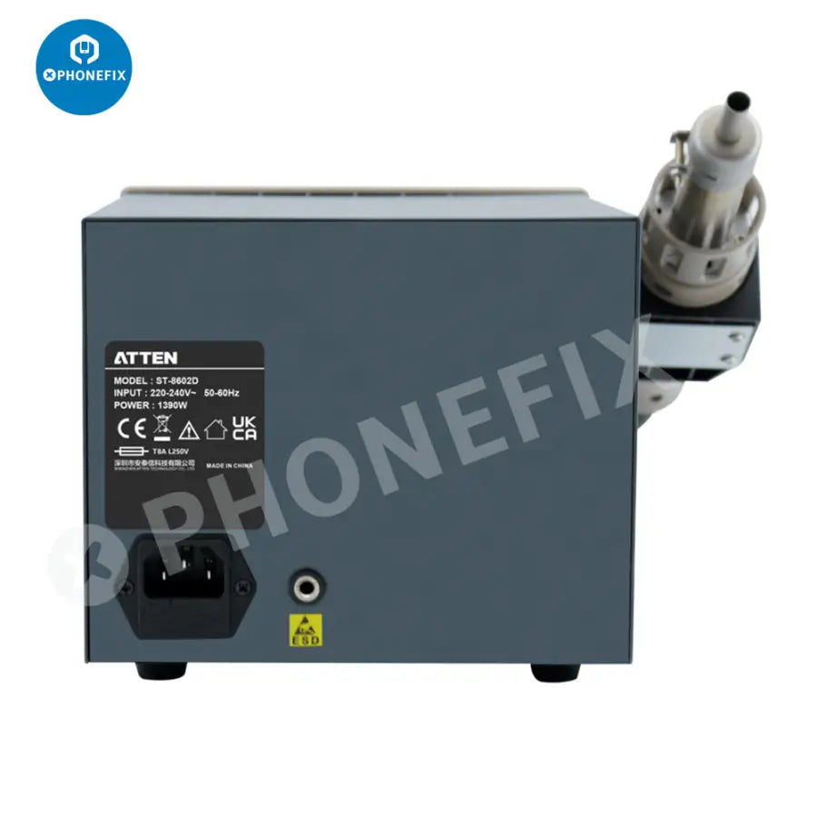 ATTEN ST-8602D 1300W 2-in-1 desoldering station with hot air gun and soldering iron, which is the upgraded version of ST-862D rework station. ATTEN ST-8602D digital hot air soldering rework station for PCB motherboard soldering desoldering repair. ATTEN ST-8602D Digital Rework Station Hot Air Gun for mobile phone repair.