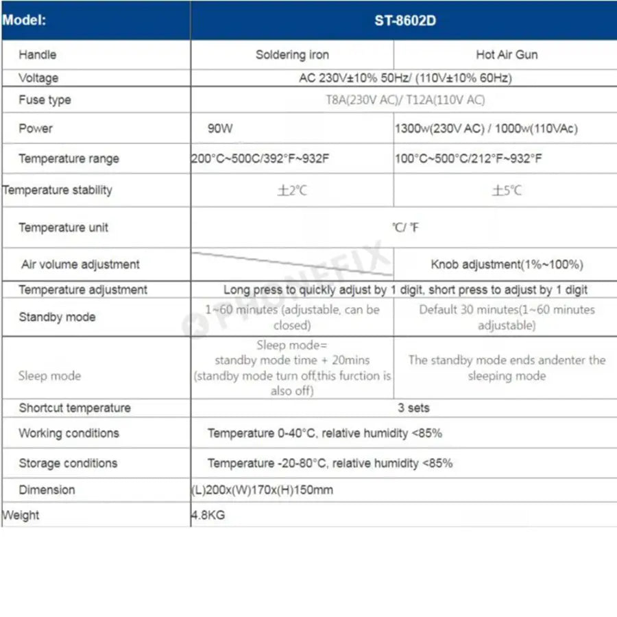 Package list: 1x ST-8602D host. 1x hot air gun handle. 1x hot air gun holder. 1x soldering iron handle. 1x soldering iron holder. 3x nozzles. 1x soldering iron tips. 1x power cable. 1x ground wire. 1x anti-scalding mat.