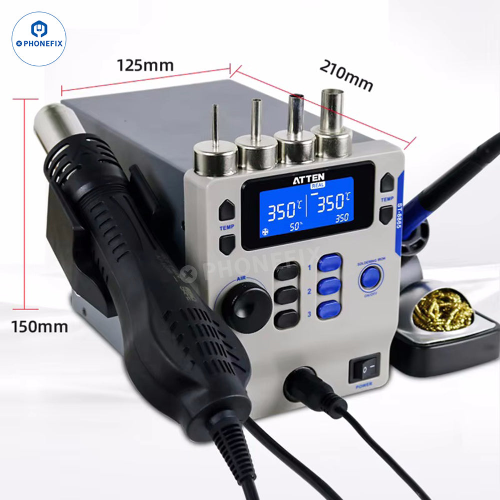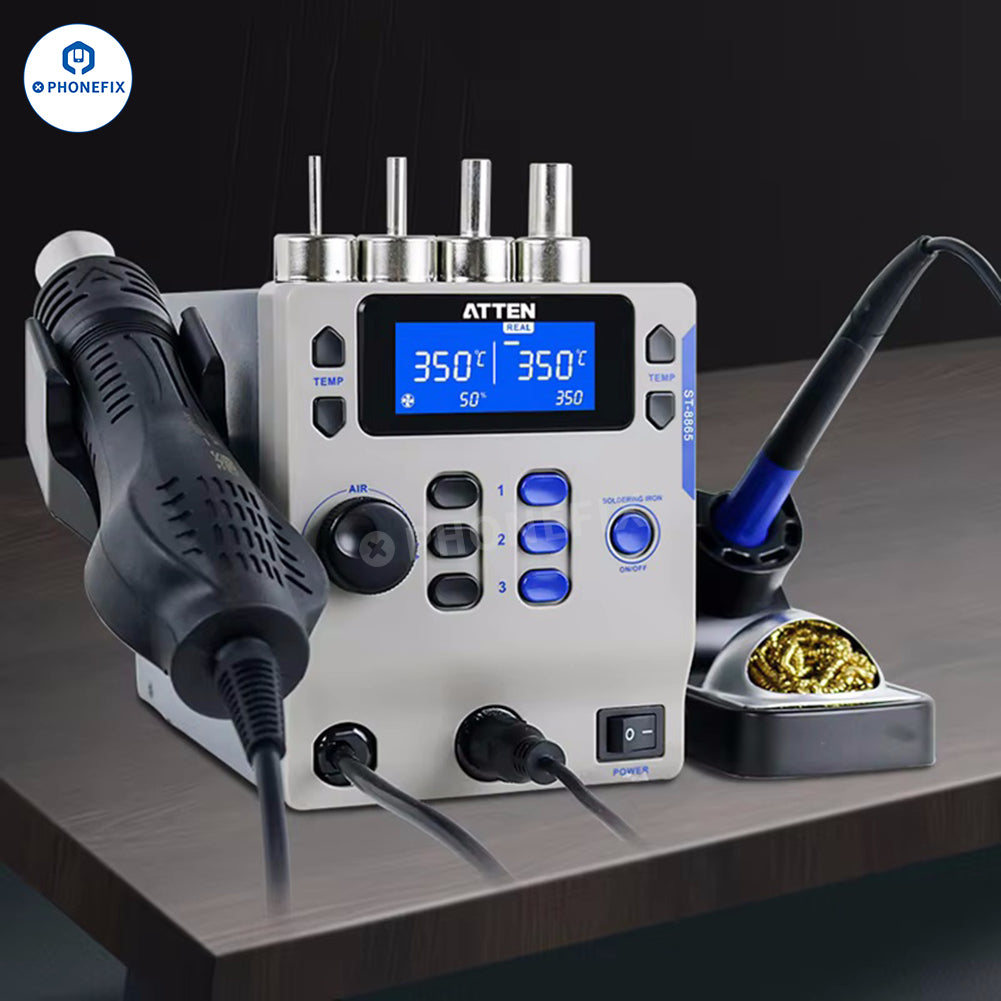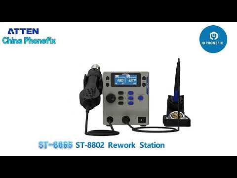 ATTEN ST-8865 (ST-8802) Intelligent 2-In-1 Digital Rework Station with Soldering Iron Hot Air Gun Dual Channels for mobile phone/tablets/electronic motherboard BGA SMD soldering/desoldering repair. ATTEN ST-8865 800W heat gun and 65W electric soldering iron, constant temperature operation, rapid heating/recovery, and automatic sleep.