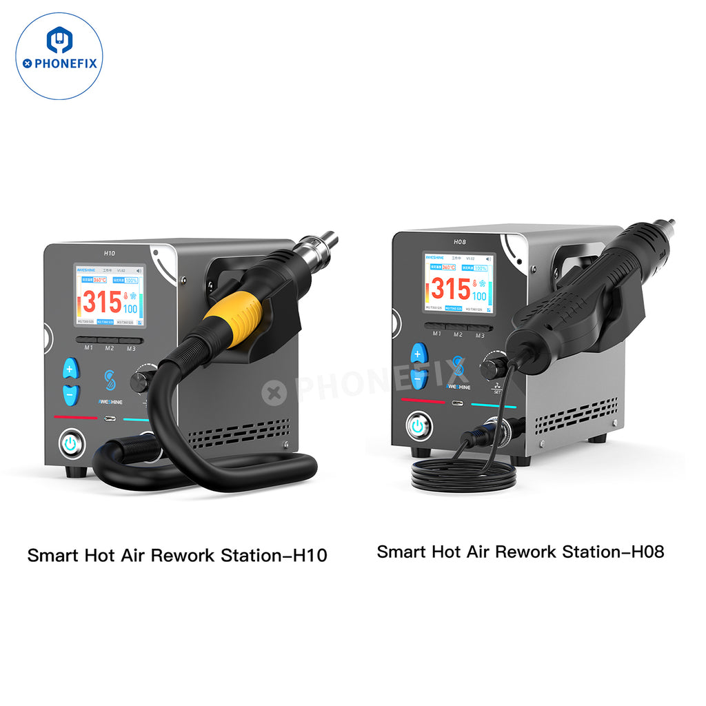 AWESHINE H08 H10 1000W Smart Hot Air Desoldering Station with digital display and 3D air nozzles for mobile phone repair, motherboard CPU BGA chip desoldering repair, Chip disassembly and installation, PCBA manufacturing, etc. 100-500℃ adjustable temperature, rapid heating and efficient desoldering. Suitable for mobile phone and electronic desoldering, repair, and rework in professional settings.