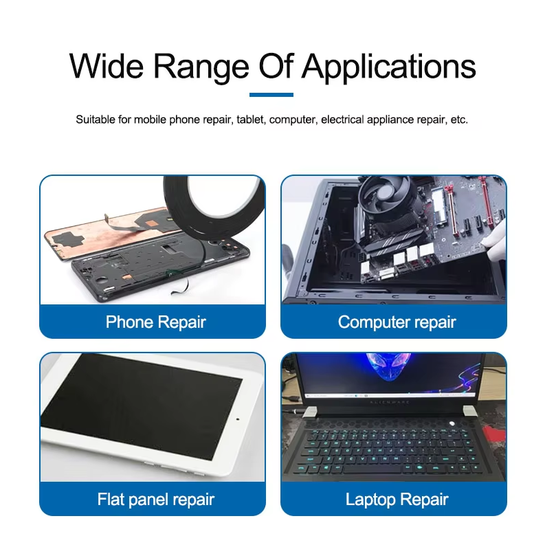 - Multi-function: Can be used for mobile phone repair, auto smooth surface, label, logo adhesive, doors and windows edge sealing, anti-dust, etc.