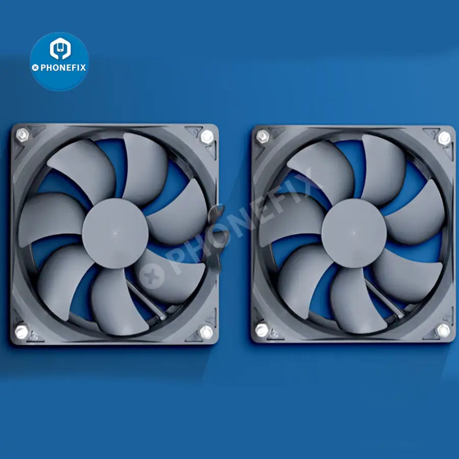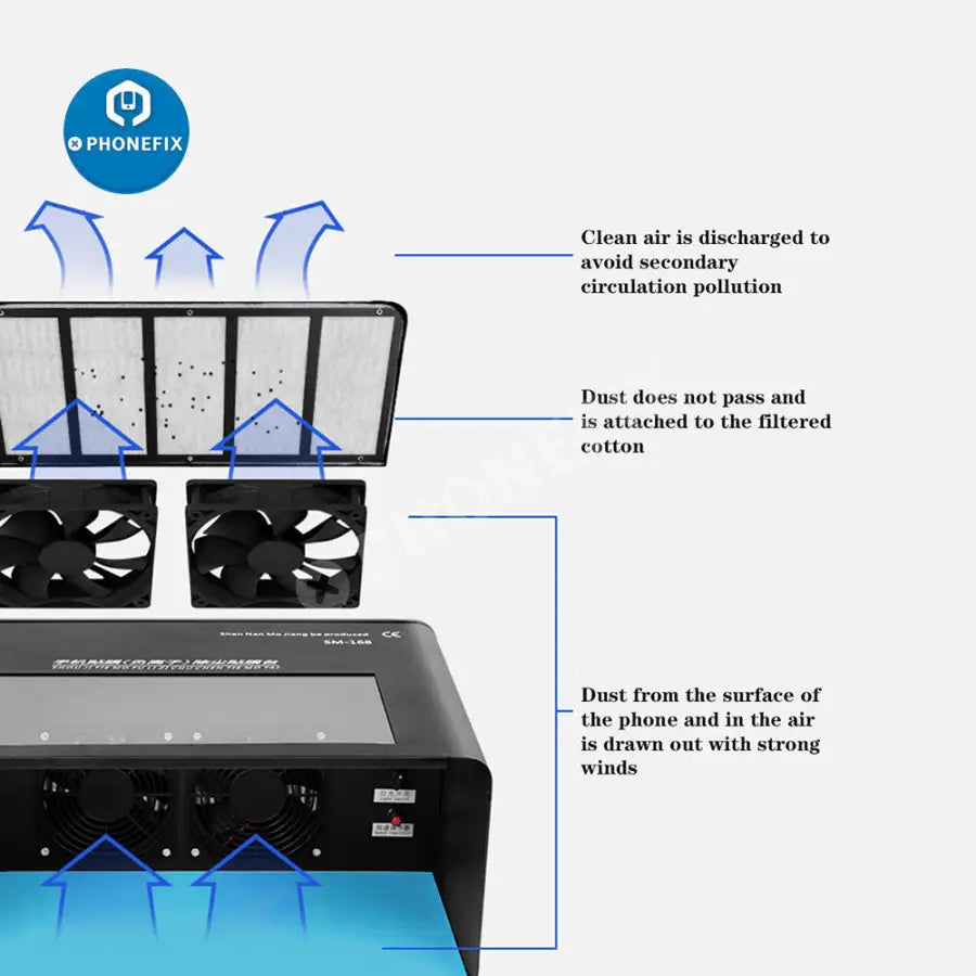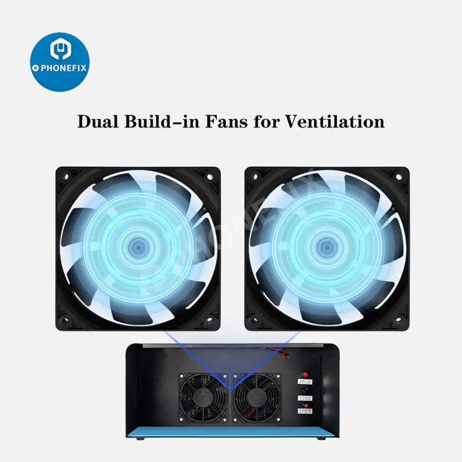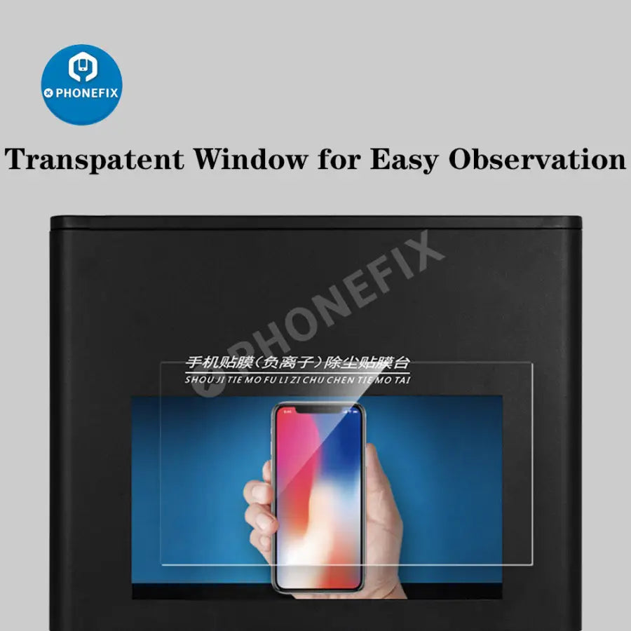 1. Transpatent window for easy observation. 2. Dual Build-in fans for ventilation. 3. With dust checking lamp, for lcd screen refurbish cleaning. Have two models: dust checking lamp and lighting. 4. Also can used for mobile phone screen protector film apply assitant workbench.