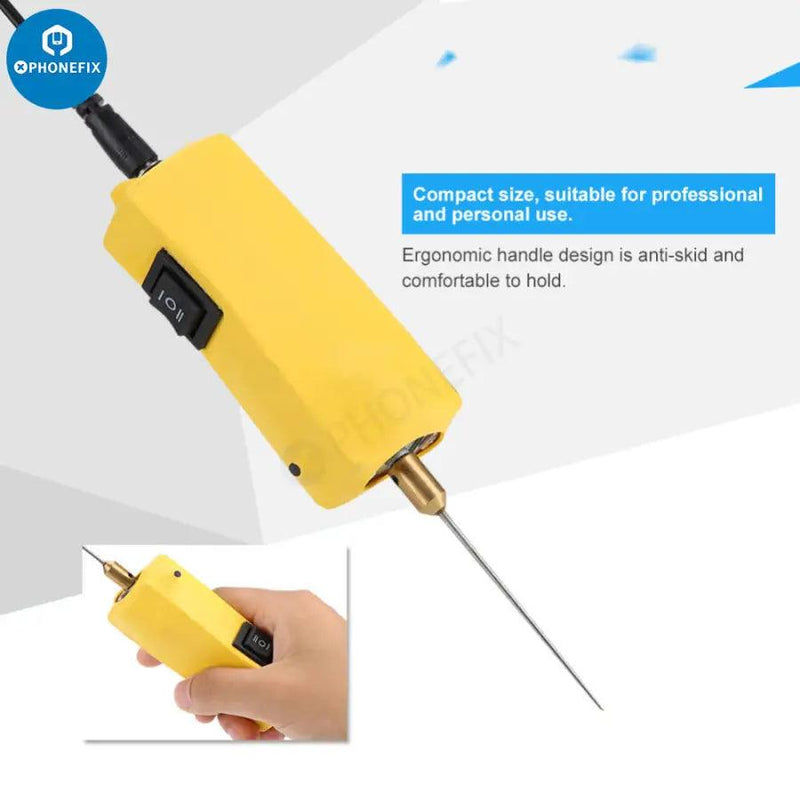 - In the process of removing glue, hold one of the fine needles, and the other hand control the motor switch;