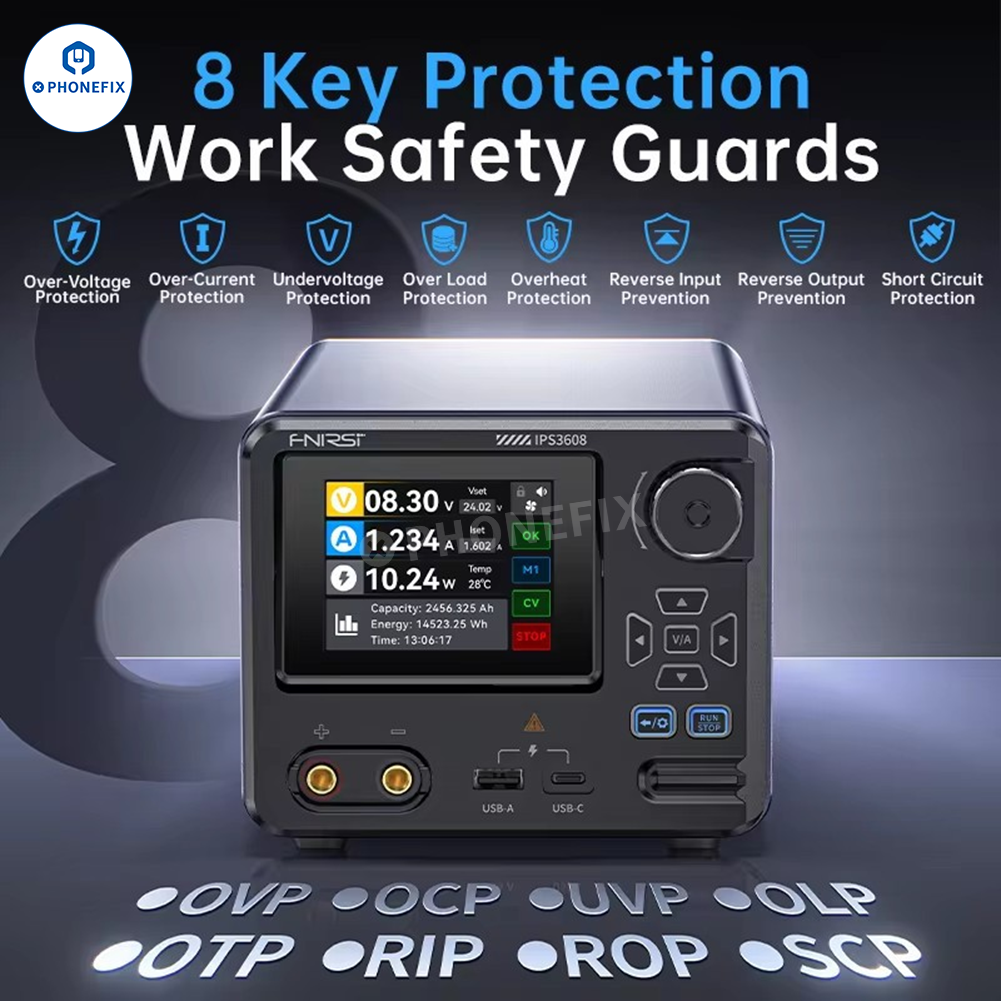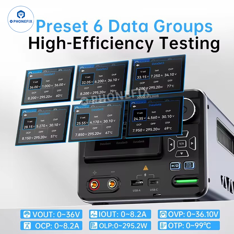 FNIRSI IPS3608 285W High Power AC-DC Power Supply 36V 8A CNC Adjustable Voltage Regulator with Intelligent Digital Control and Uplink Function for Mobile Phone Repair. Ultra-low ripple and multi-protocol fast charging output, real-time current and voltage curve recording, constant voltage and constant current output, multiple protection. Suitable for mobile phone, laptop, tablet and other electronic repairs.