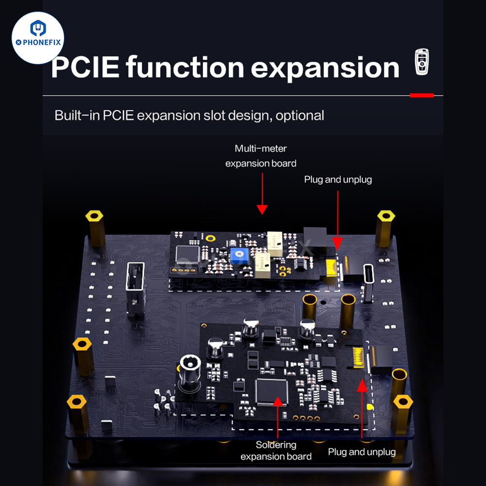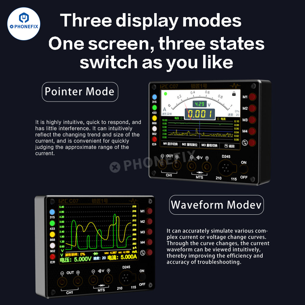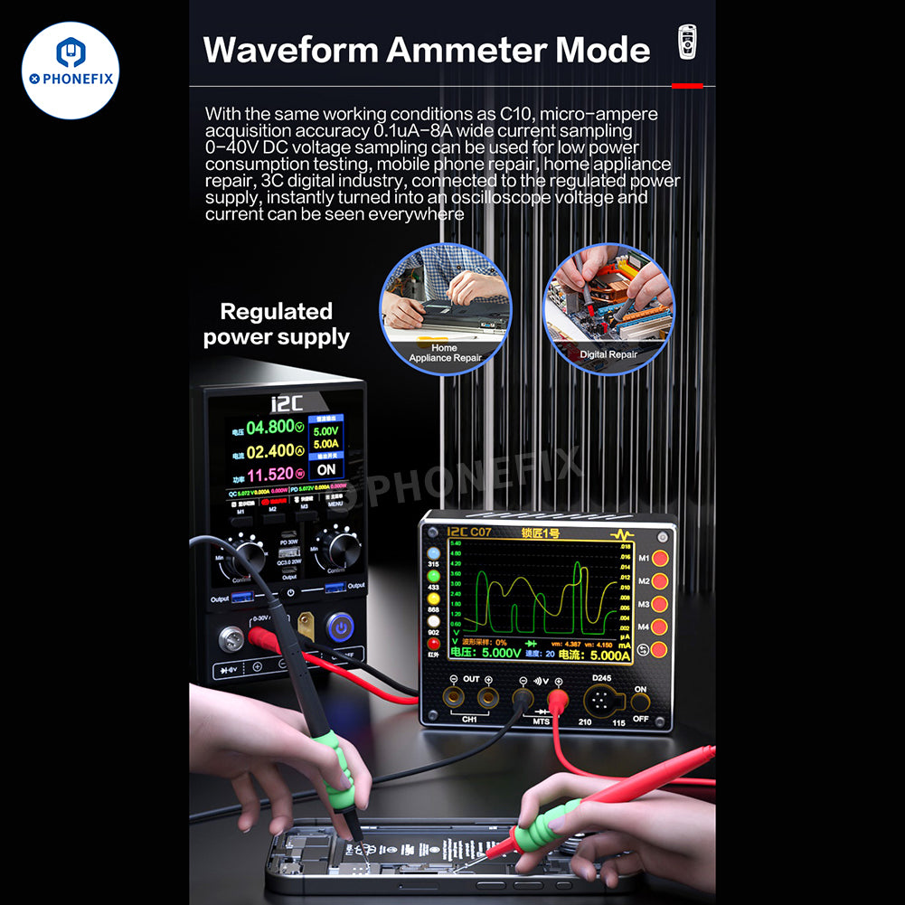 i2C C07 Locksmith NO.1 Power Supply Ammeter with Car Remote Control Frequency Test Board and Multimeter Pen for vehicle or electronic product remote control frequency detection and repair, current and voltage measurement, diode measurement. Use i2C C07 Ammeter with 210 245 115 soldering iron handle for mobile phone repair, such as phone motherboard BGA soldering, or welding vehicle remote control circuit, etc.