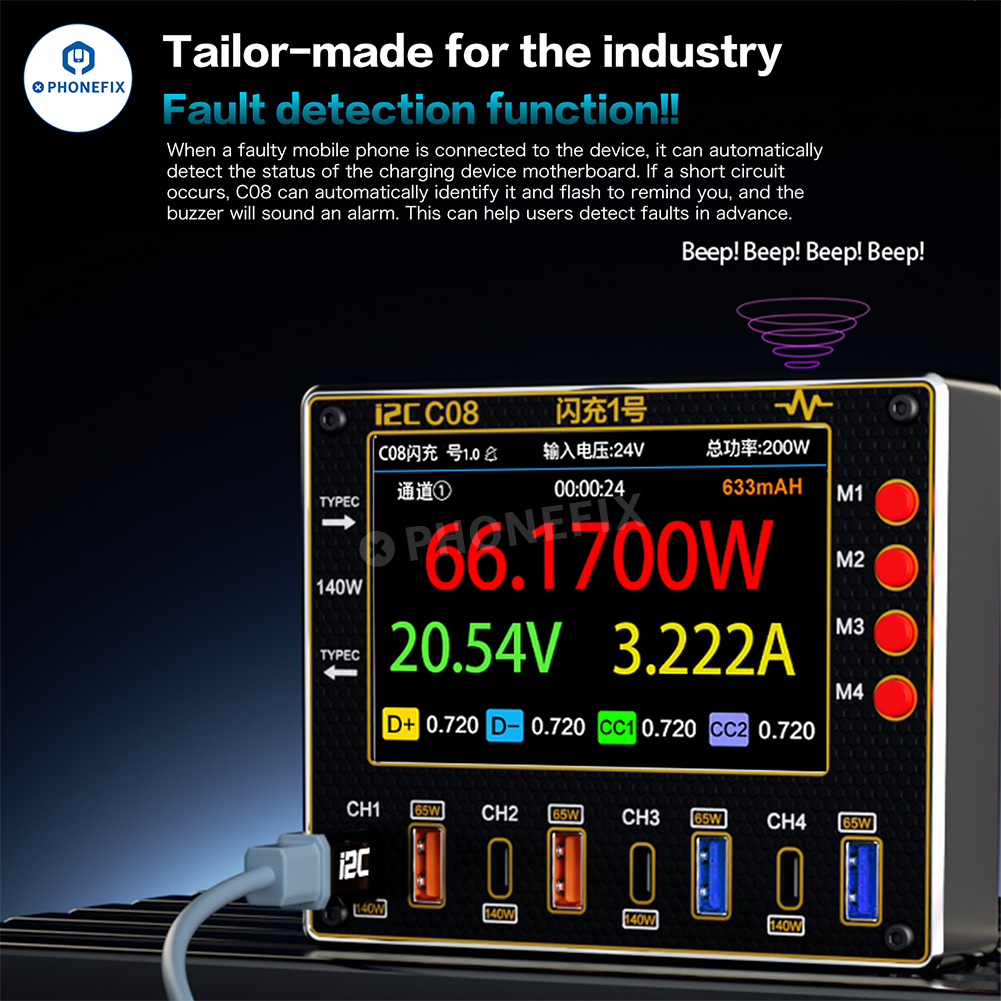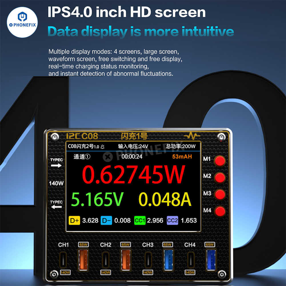i2C C08 Flash Charger NO.2 140W Ultra Fast Charging Station Ammeter with USB Type-C 8 Ports for iPhone Huawei Mobile Phones and Tablets. i2C C08 Flash Charger PD QC full protocol fast charging adapter with 4.0-inch display supports Android Android HarmonyOS iOS systems, with charging voltage and waveform detection function, making it suitable for rapidly charging smartphones, tablets, and laptops.