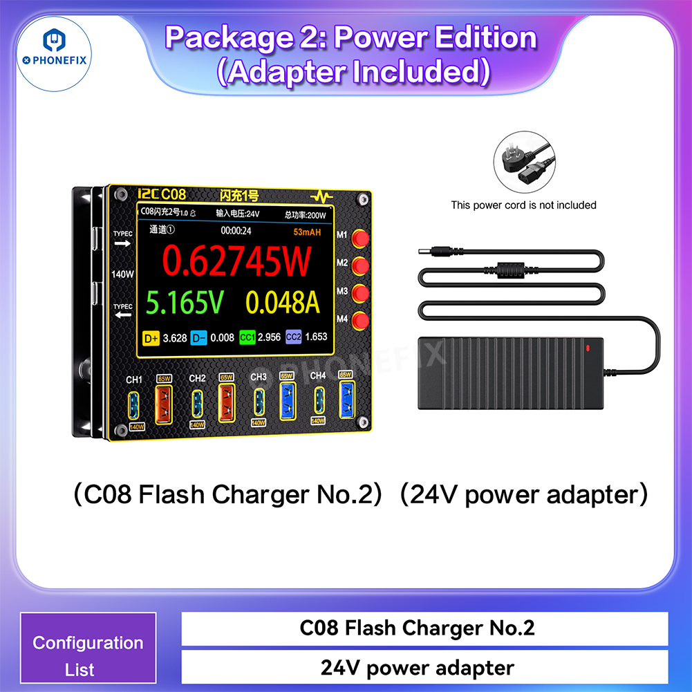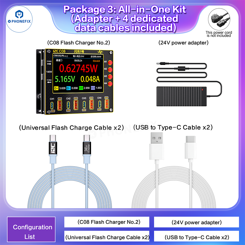 3. C08 Flash Charger No.2 host +24V Power Adapter+2x Universal Flash Charger Cable+2x USB to Type-C Cable.