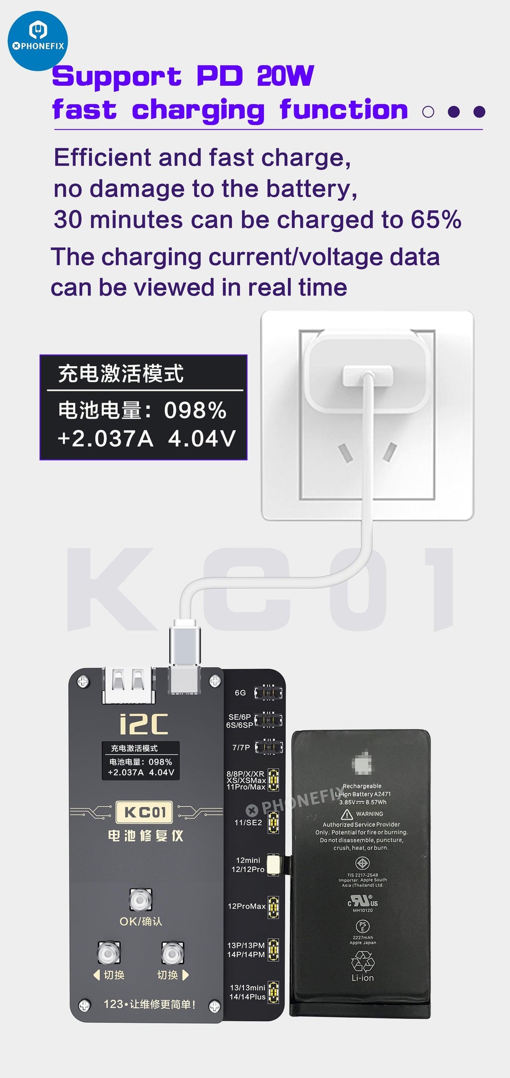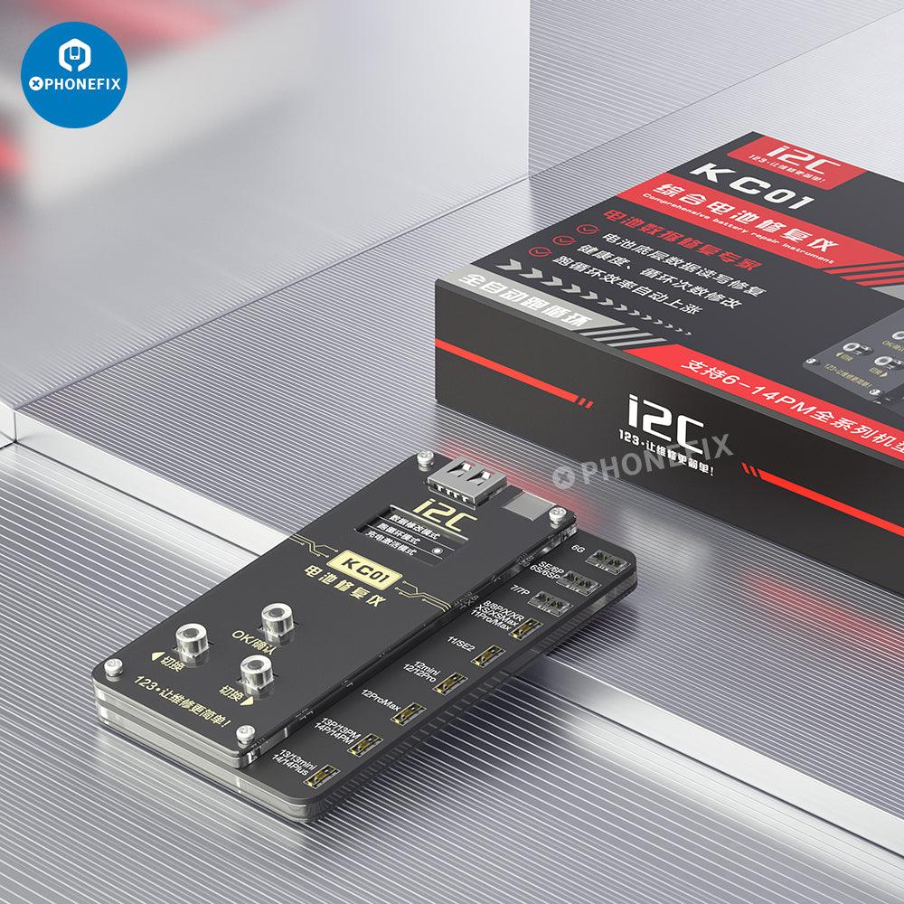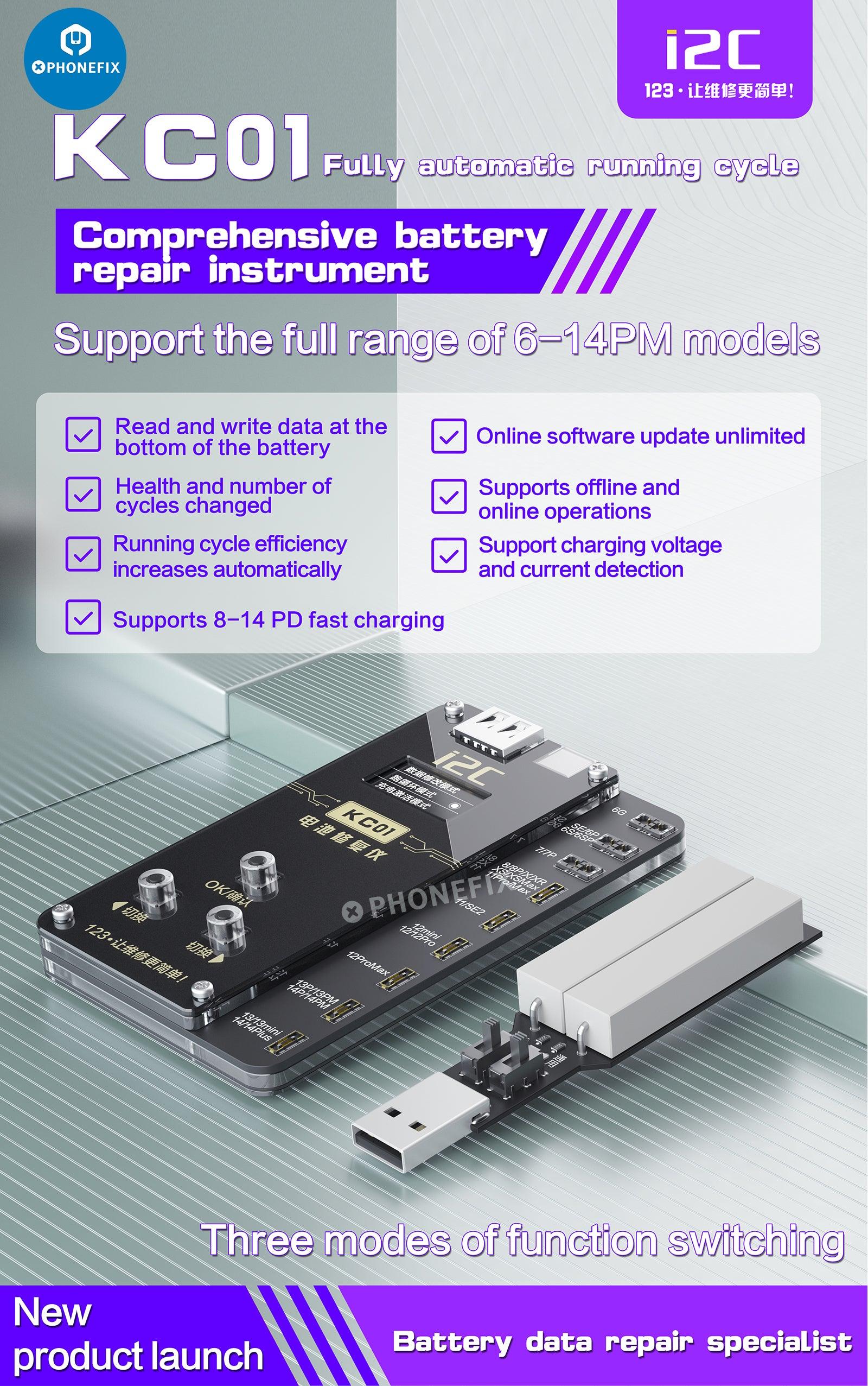i2C KC01 Multi-function Comprehensive Battery Repair Instrument for iPhone 6-15 Pro Max battery health data cycle times reading and writing modification, etc. i2C KC01 battery repair instrument iPhone battery data read write calibrator. i2C KC01 battery repair tool for reset iPhone battery cycle data, calibrate and renovate iPhone Battery Health.