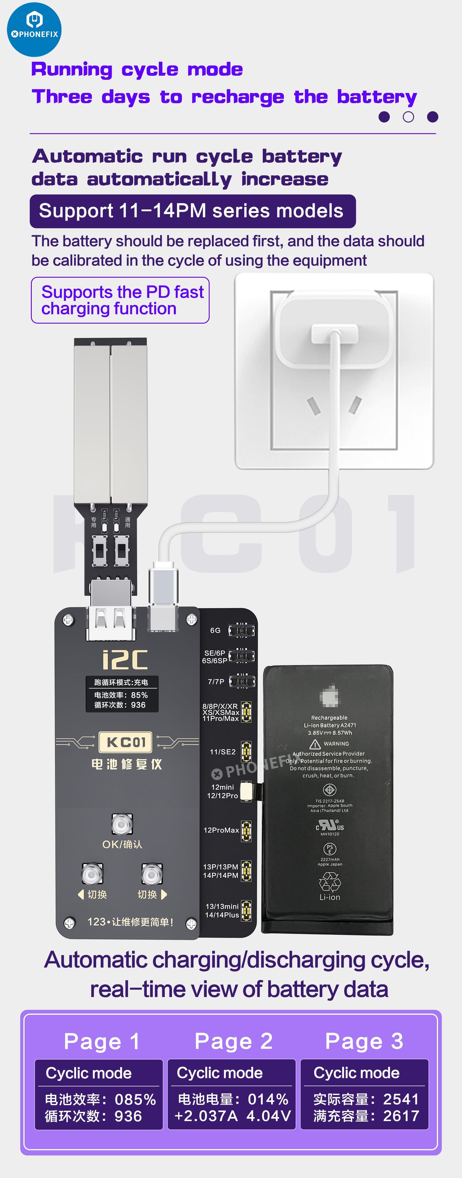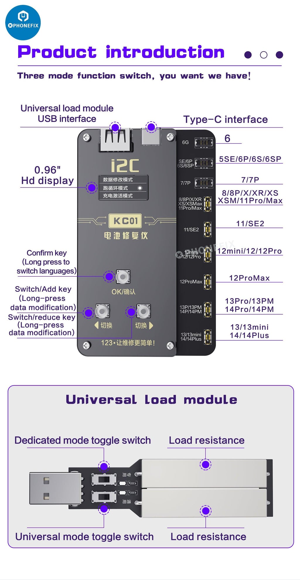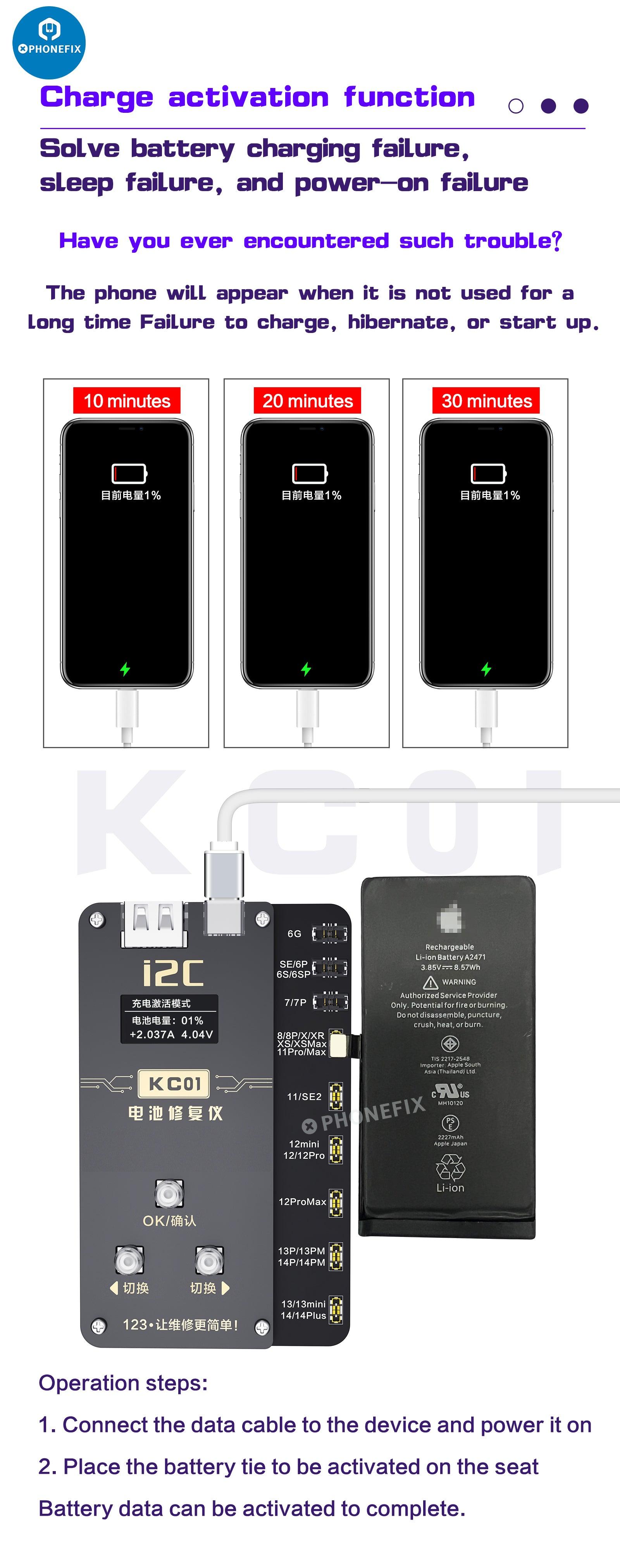 i2C KC01 Multi-function Comprehensive Battery Repair Instrument for iPhone 6-15 Pro Max battery health data cycle times reading and writing modification, etc. i2C KC01 battery repair instrument iPhone battery data read write calibrator. i2C KC01 battery repair tool for reset iPhone battery cycle data, calibrate and renovate iPhone Battery Health.