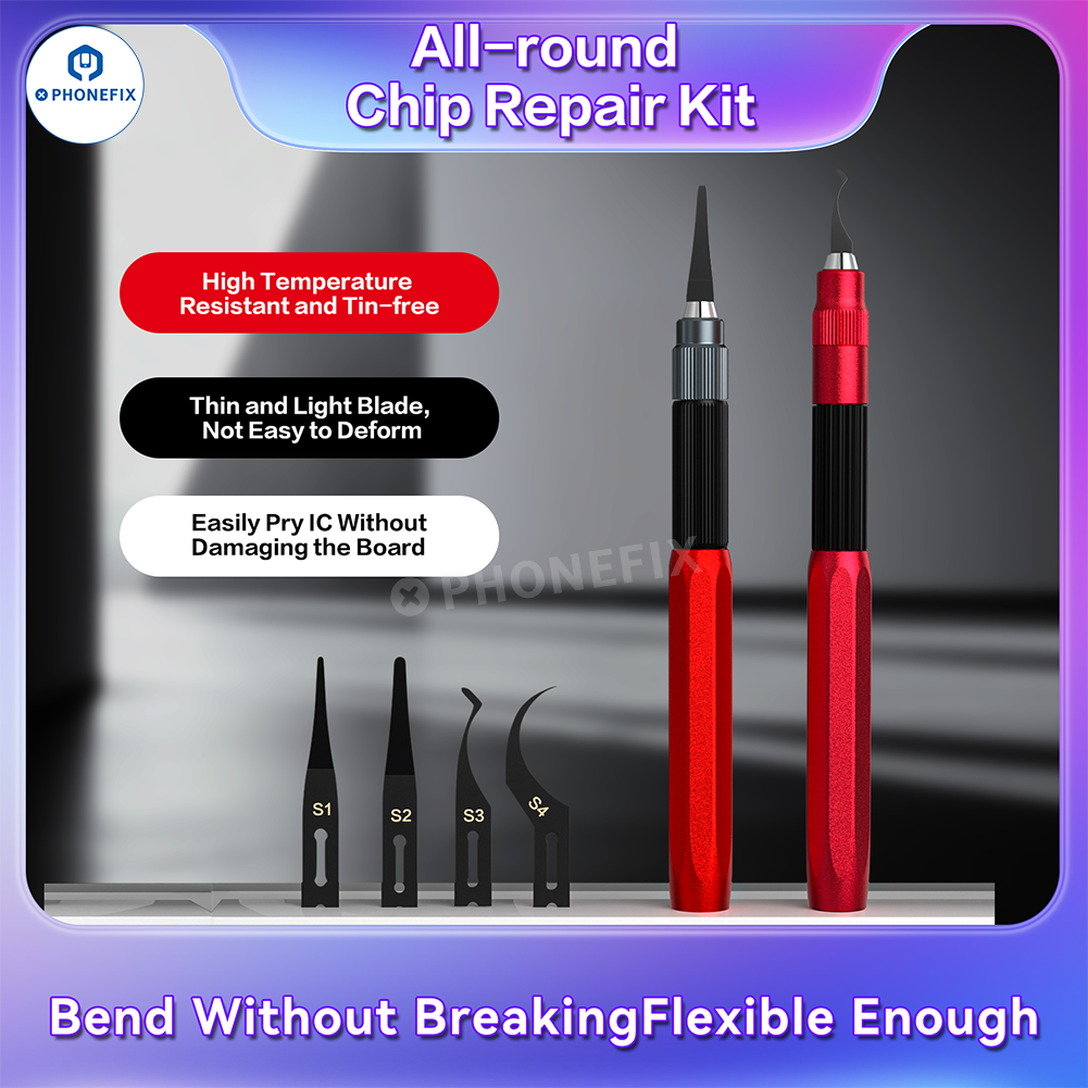 i2C Mobile Phone Repair Blade Set All-Round Chip Repair Kit with high-temperature resistant solder blades for removing glue, scraping solder paste, and prying PCB BGA CPU Nand chips during phone repair or laptop repair. The ultra-thin blade and high-carbon steel construction ensure efficient repairs without damaging circuit boards and chips. The handle, made of aerospace-grade aluminum alloy, is robust and durable, suitable for various repair environments. It works even better when used with a hot air gun.