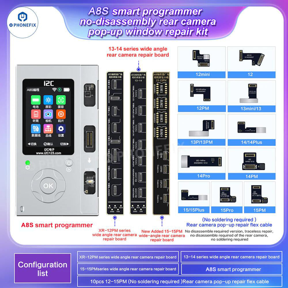 i2C iPhone Camera Repair Kit Removes iPhone 11-15 Pro Max "Important Camera Message" Pop-Up Window. i2C tag-on rear camera repair flex cable for iPhone 11/12/13/14/15 Pro Max. i2C A8S programmer with wide angle camera repair board and tag-on no-disassembly camera repair cable fixes iPhone 11-15 Pro Max camera pop-up window problem perfectly.