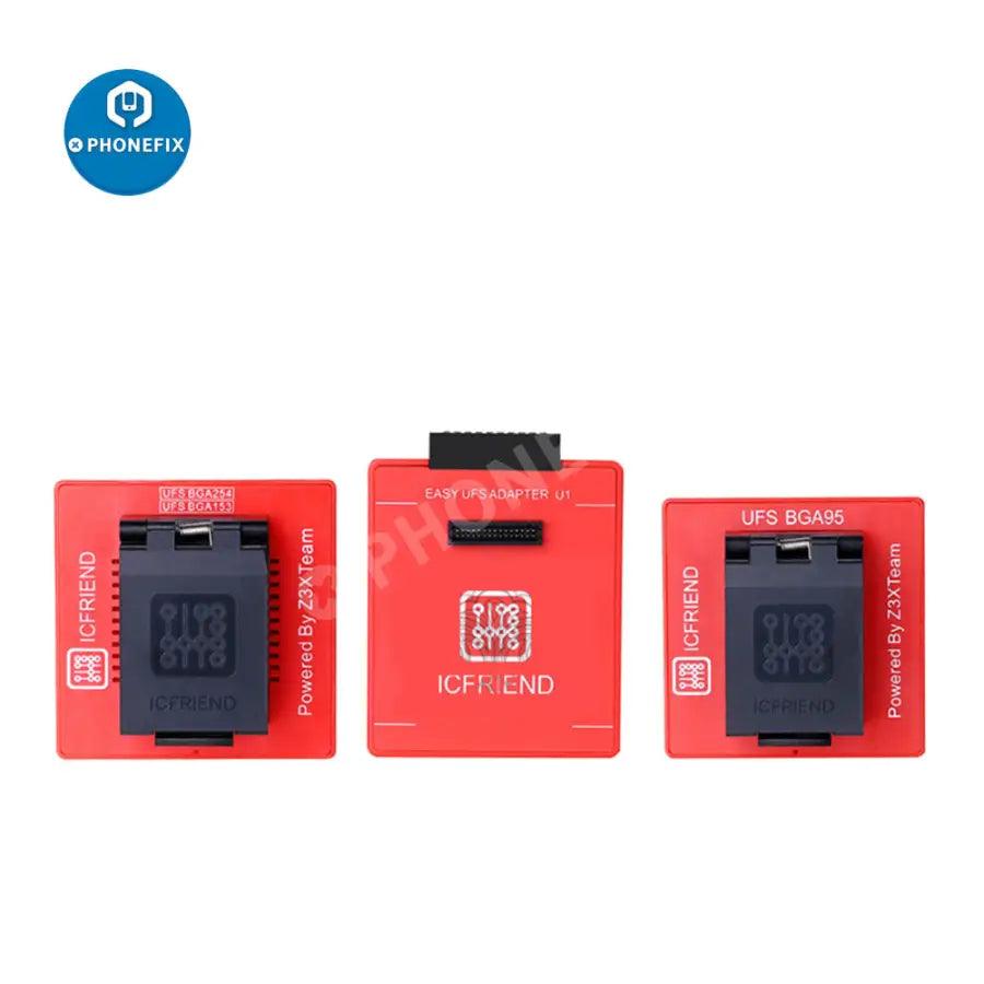 ICFRIEND UFS chip reader socket(UFS BGA153/UFS BGA254/BGA297). ICFRIEND 4 in 1 UFS Chip Reader Set is intended for Z3X Easy JTAG Plus Box and allows you to read/write data on the newest UFS chipsets.