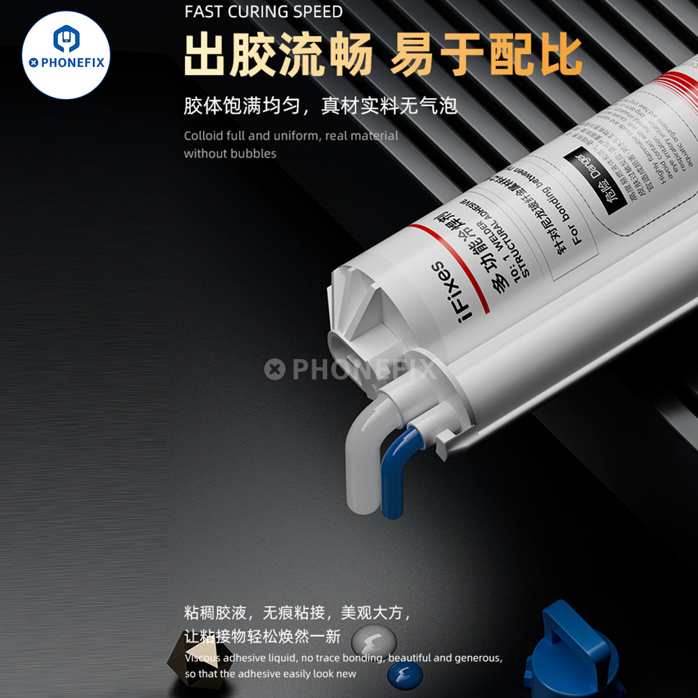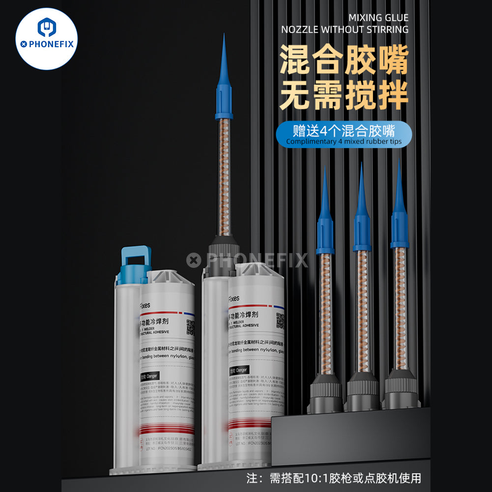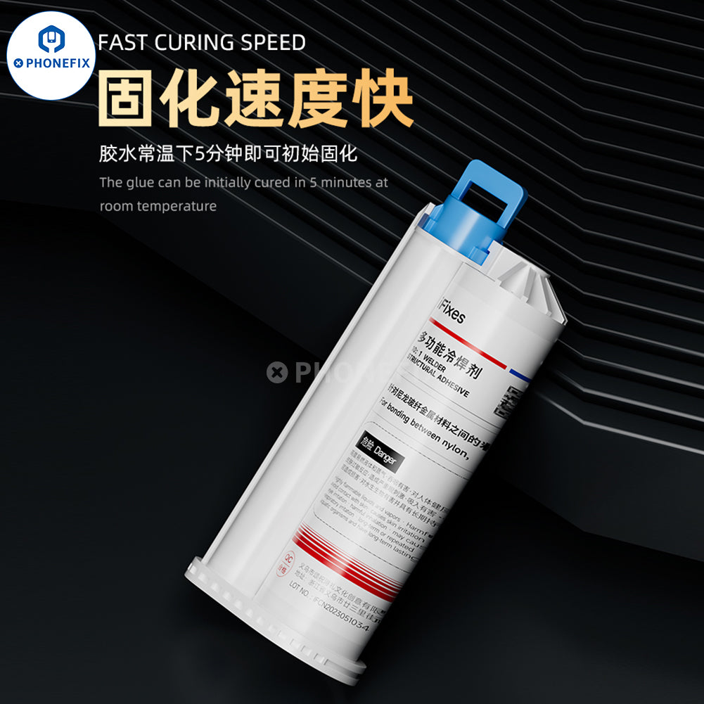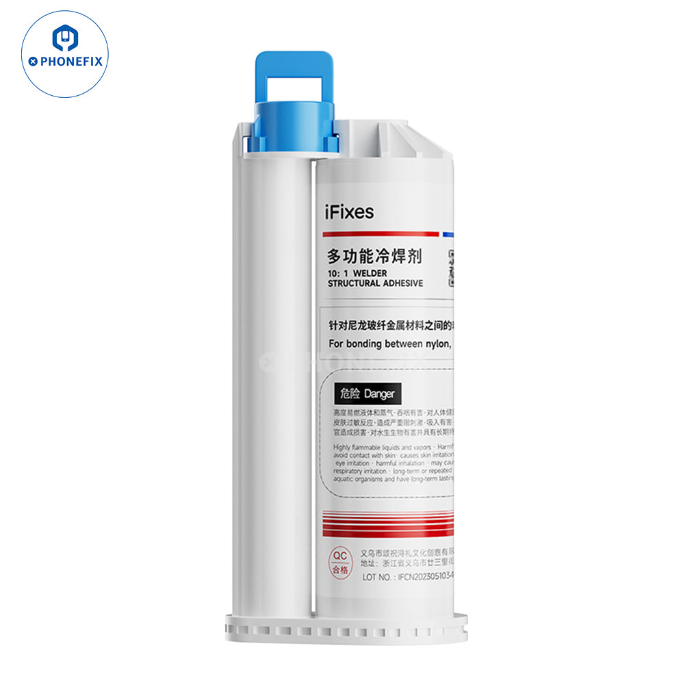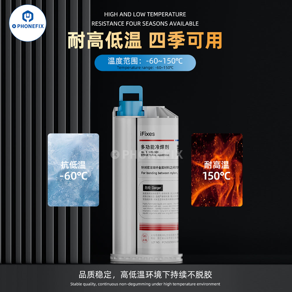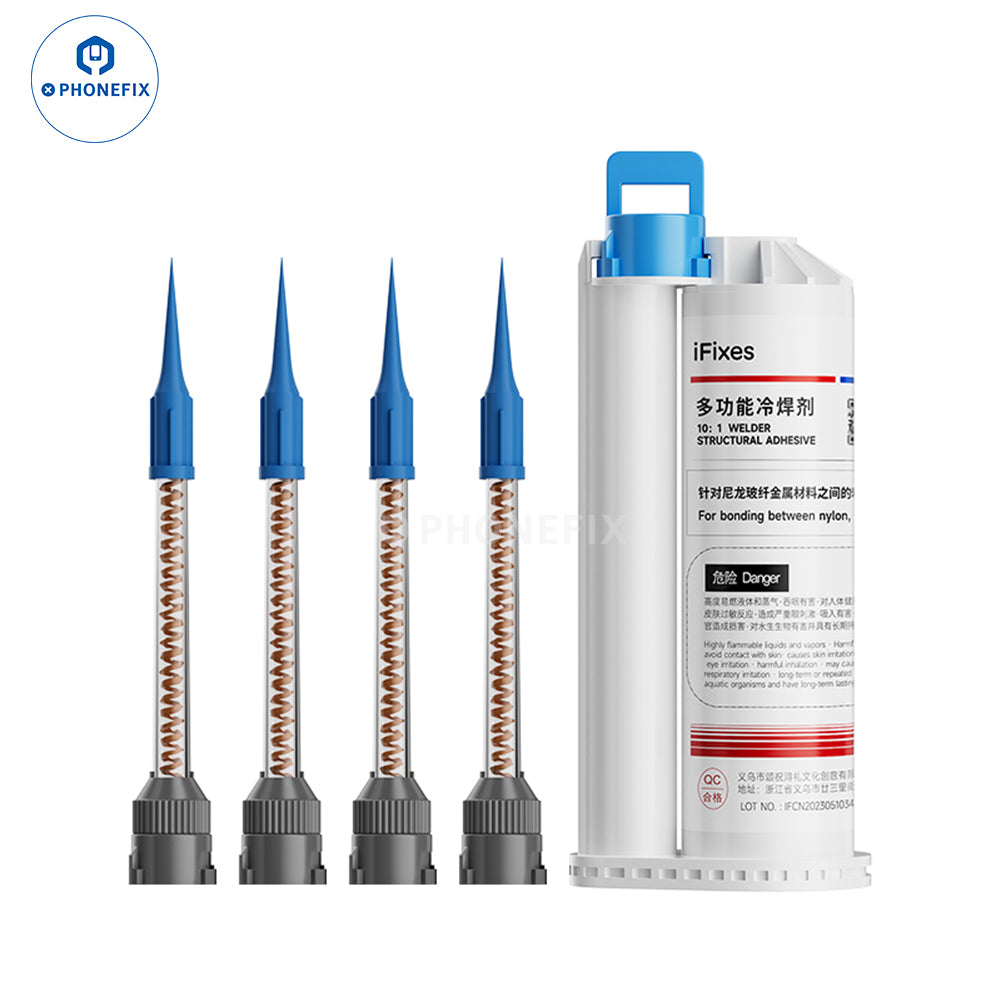 iFixes i14167 multifunctional cold solder flux metal shell assembly glue for bonding between bylon, glass, metal shell, magnet brackets, and acrylic ect. High temperature resistance and strong adhesion structural adhesive iFixes i14167 AB glue cold solder flux with needles for mobile phone, tablets, laptops, and other items repair.