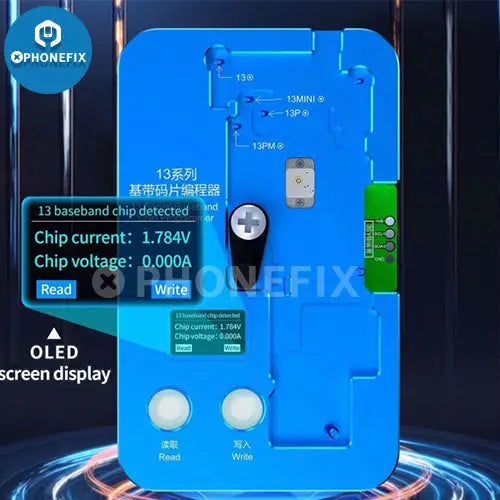 Features: 1. Support to read and write iPhone 13-14 Pro Max baseband chip data without disassembly. 2. With an OLED screen display. 3. More board without removing the code chip, time and labor saving. 4. Voltage and current monitoring, short circuit alarm. 5. Single machine operation, with two buttons to read and write. Simple and convenient operation. 6. Support offline and online operation on JC Repair Assistant. 7. Online operation, local backup data never lost. 8. With flying wire test points, it supports testing more models.