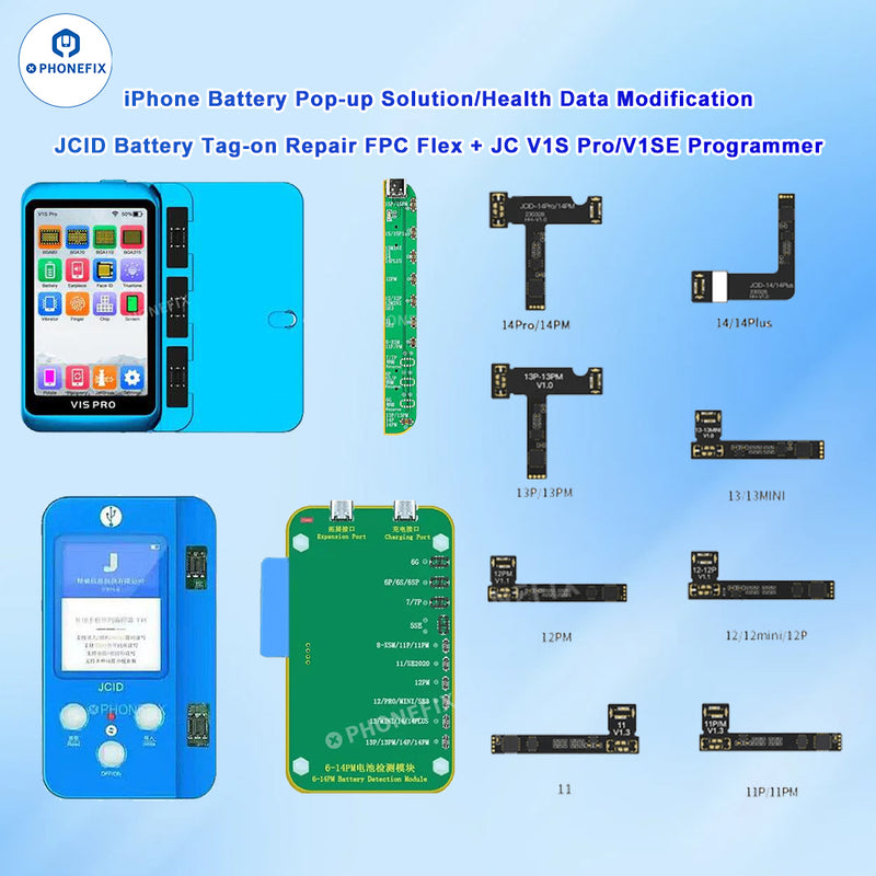 JCID 4th-Gen Battery tag-on repair FPC flex cable for iPhone 11-15 Pro Max non-genuine iPhone battery pop-up windows removal and battery health data modification. JCID battery repair FPC upgrade technology has clear voltage reduction and capacity locking functions, which solves the problem of iPhone battery incomplete charging and rapid power loss due to voltage limitations. Support to Run Diagnostics & No Service History to keep repairs clean and professional. No reboot required. One-click clearing of voltage drop and capacity lockout, zero cycling. 0-100% battery health data, remove non-genuine battery error.