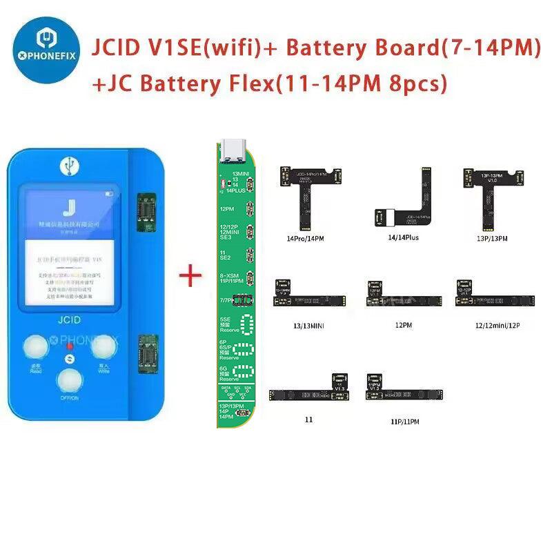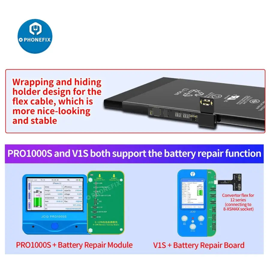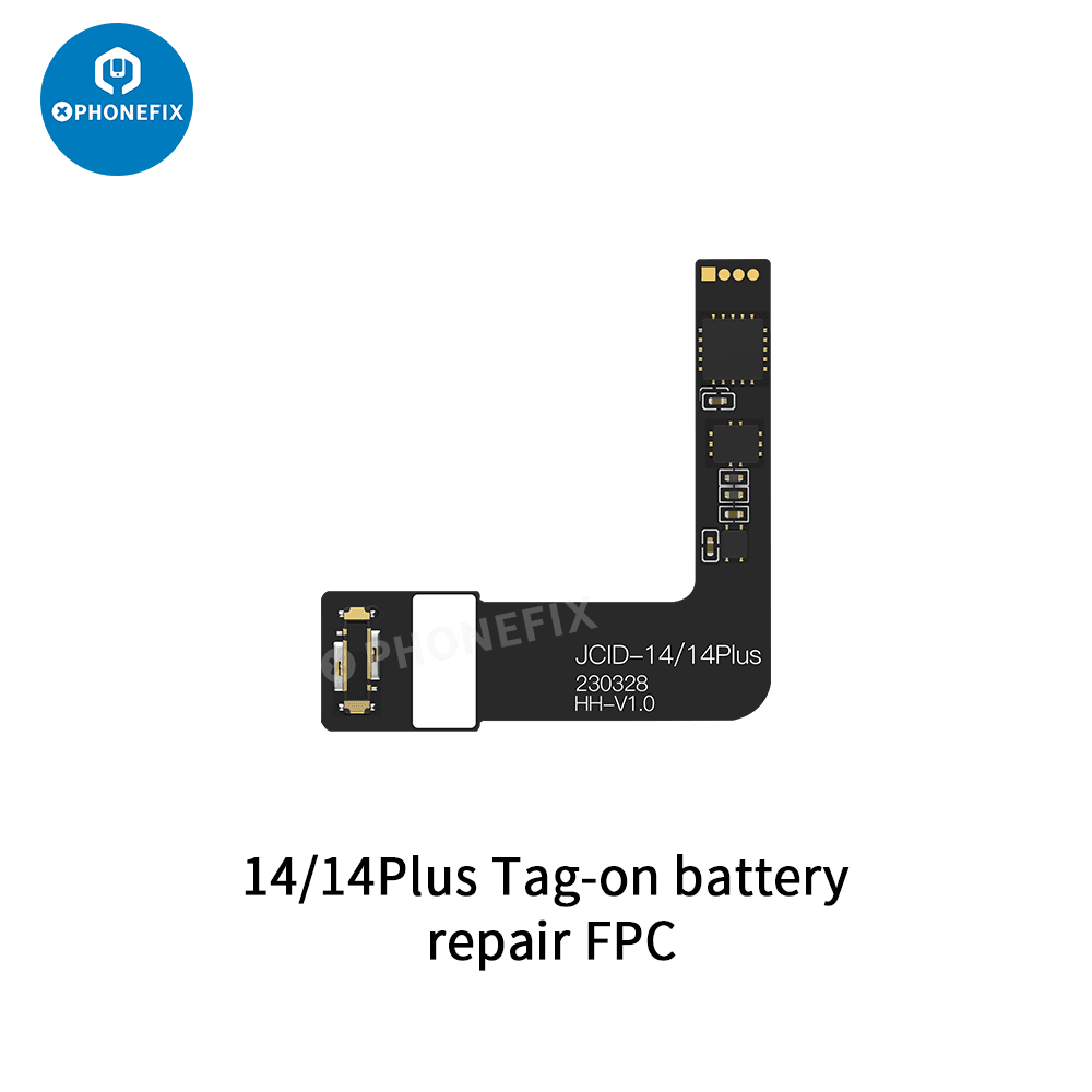 JCID 4th-Gen Battery tag-on repair FPC flex cable for iPhone 11-15 Pro Max non-genuine iPhone battery pop-up windows removal and battery health data modification. JCID battery repair FPC upgrade technology has clear voltage reduction and capacity locking functions, which solves the problem of iPhone battery incomplete charging and rapid power loss due to voltage limitations. Support to Run Diagnostics & No Service History to keep repairs clean and professional. No reboot required. One-click clearing of voltage drop and capacity lockout, zero cycling. 0-100% battery health data, remove non-genuine battery error.