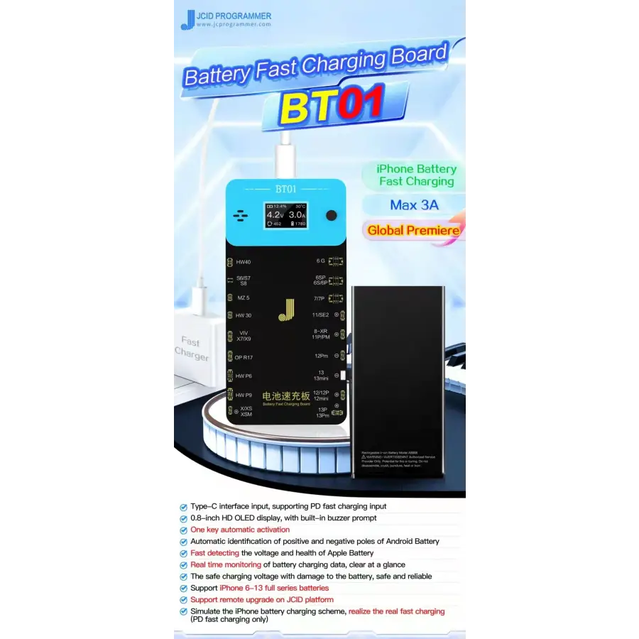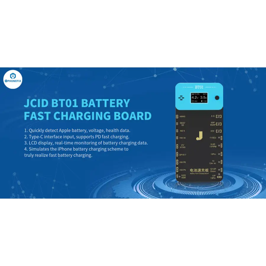 JCID BT01 battery fast charging board LCD display Type-C PD charger tester, real-time monitoring apple battery voltage health data, realize fast battery charging.