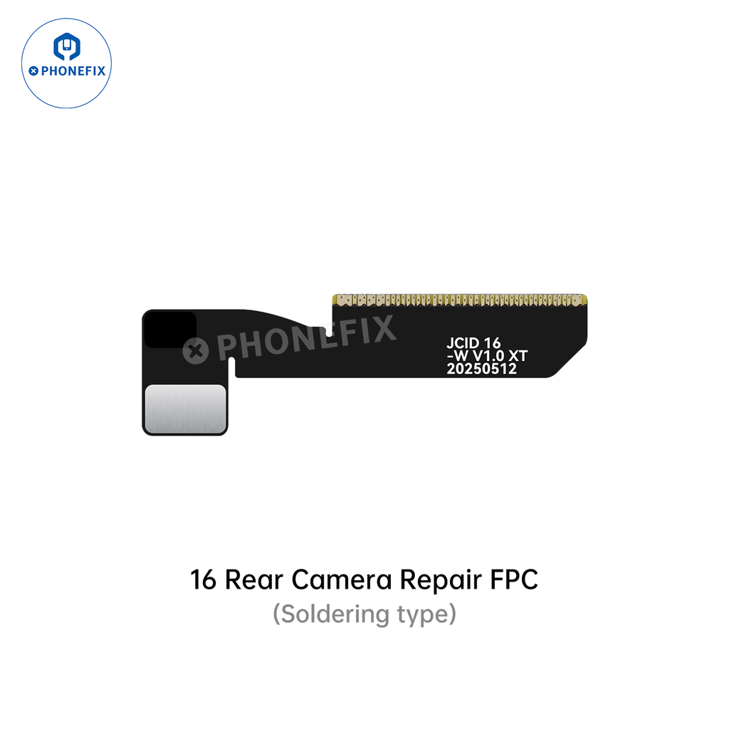 JCID Rear Camera Repair FPC Cable solves iPhone 11-16 Pro Max camera code mismatch and pop-up issues caused by non-genuine rear camera. JC rear camera repair FPC cable (soldering type) used with JCID wide angle camera repair adaptor and V1SE/V1S PRO programmer to fix the problems of AISI Data in Green and system pop-up windows on newly installed iPhone rear camera.