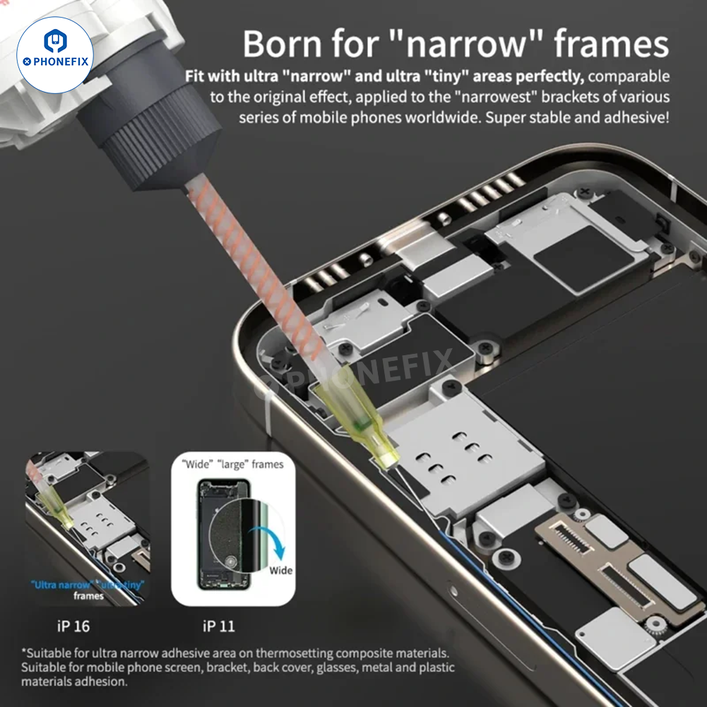 JCID SP16 Super Bracket Adhesive Universal AB Glue used with DM-050 10:1 Glue Gun for bonding ultra-narrow frames and brackets in mobile phones, electronic devices, and DIY projects. JCID SP16 bracket adhesive uses an AB mixed high-viscosity formula, resulting in extremely high adhesion and stability. It dries quickly and has strong bonding strength.