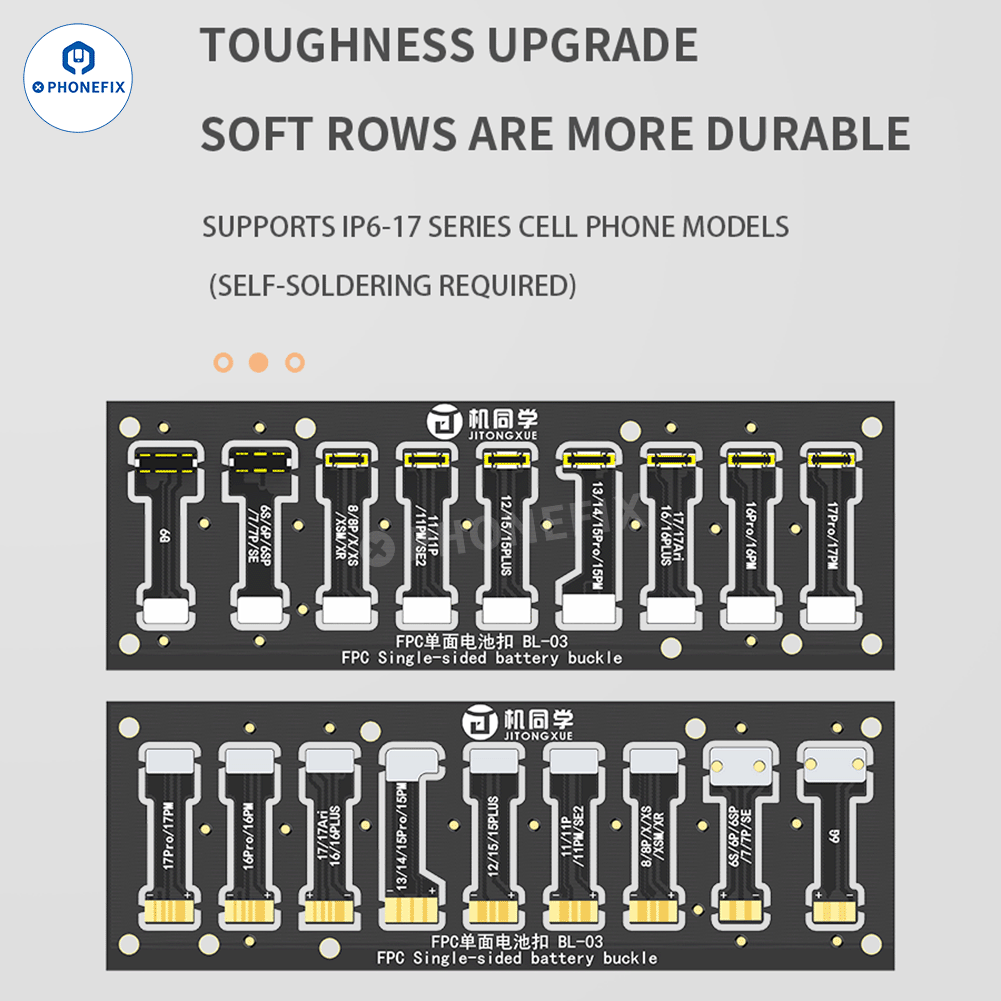 JTX BL-03 iPhone 6-17 Pro Max Power Cable Battery Buckle Soft FPC Connector. JTX BL-04 Android Boot Cable Battery Connector with ID resistor. JTX BL-03 BL-04 battery connector for iPhone and Android phone repair. Used with Mobile Phone DC power cable, no peeling, no slipping, easy to use.