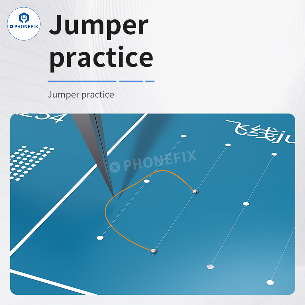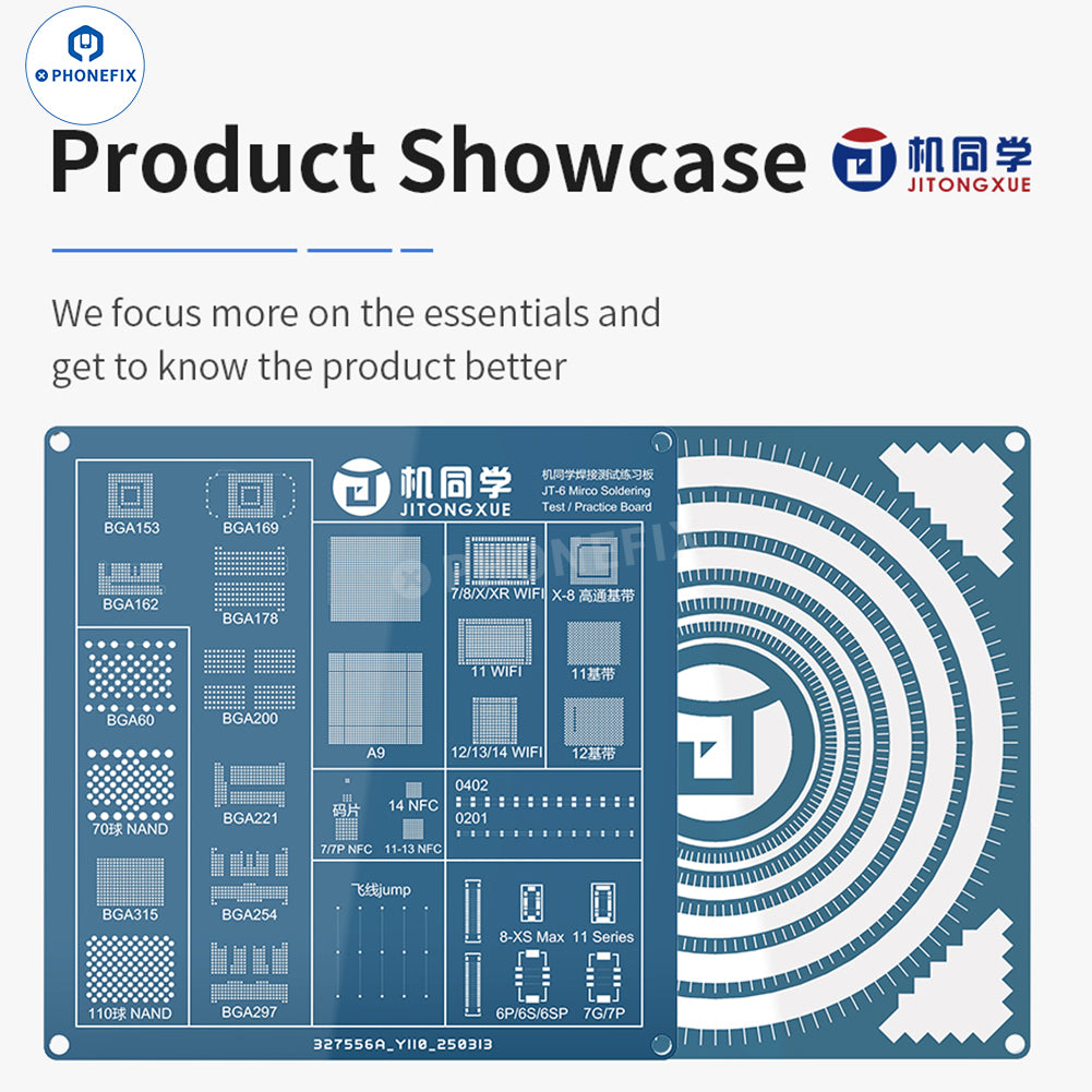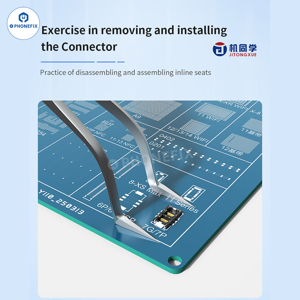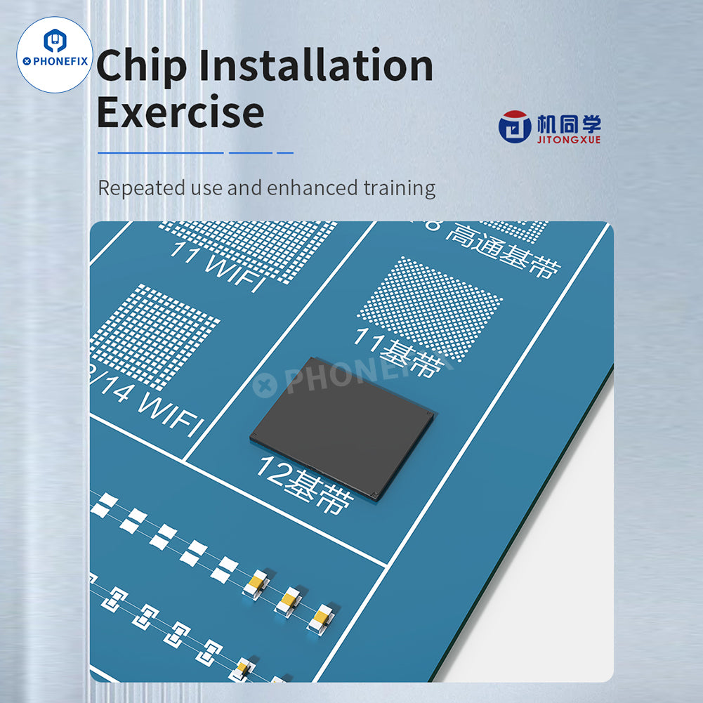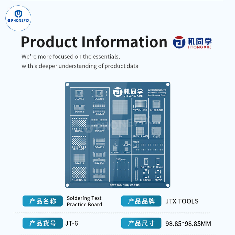 JTX JT-6 Micro Soldering Test Practice Board used for Mobile Phone Repair Skills Training. Such as chip disassembly, jumper soldering, FPC connector disassembly, BGA soldering training, and test soldering iron, solder paste, solder wire and other welding materials.