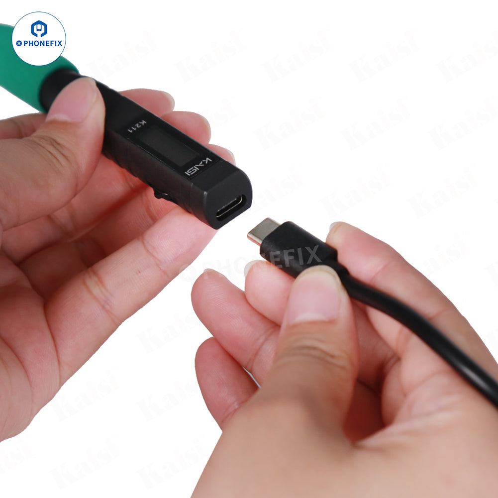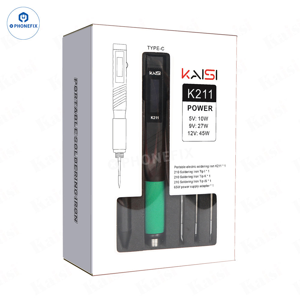 Kaisi K211 USB portable soldering iron with smart sleep and supports C210 soldering iron tips for mobile phone PCB BGA repair. Kaisi K211 soldering iron heats up quickly and comes standard with a 65W charging adapter and Type-C interface power supply.