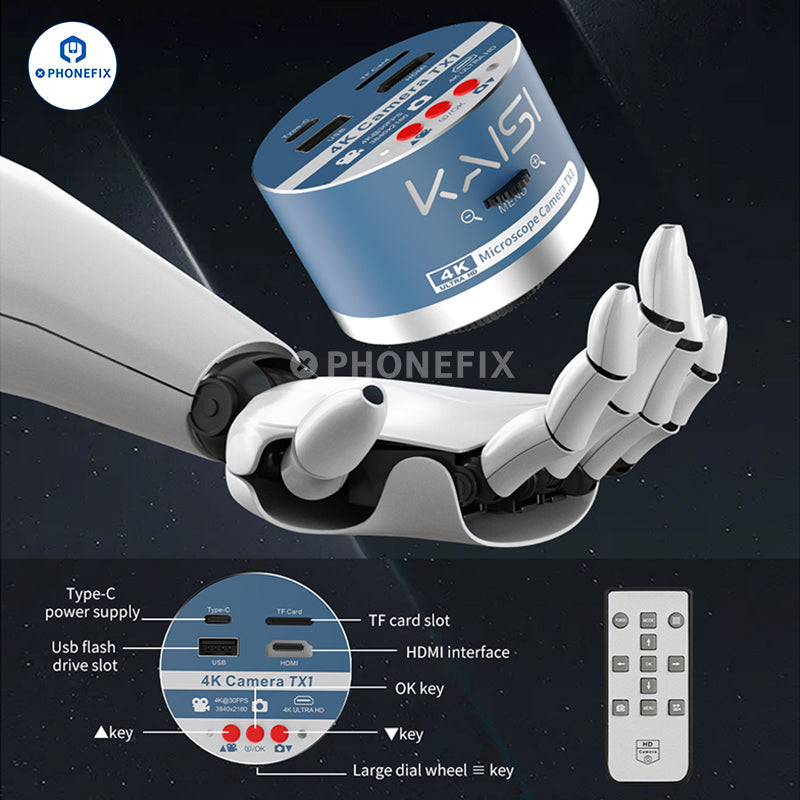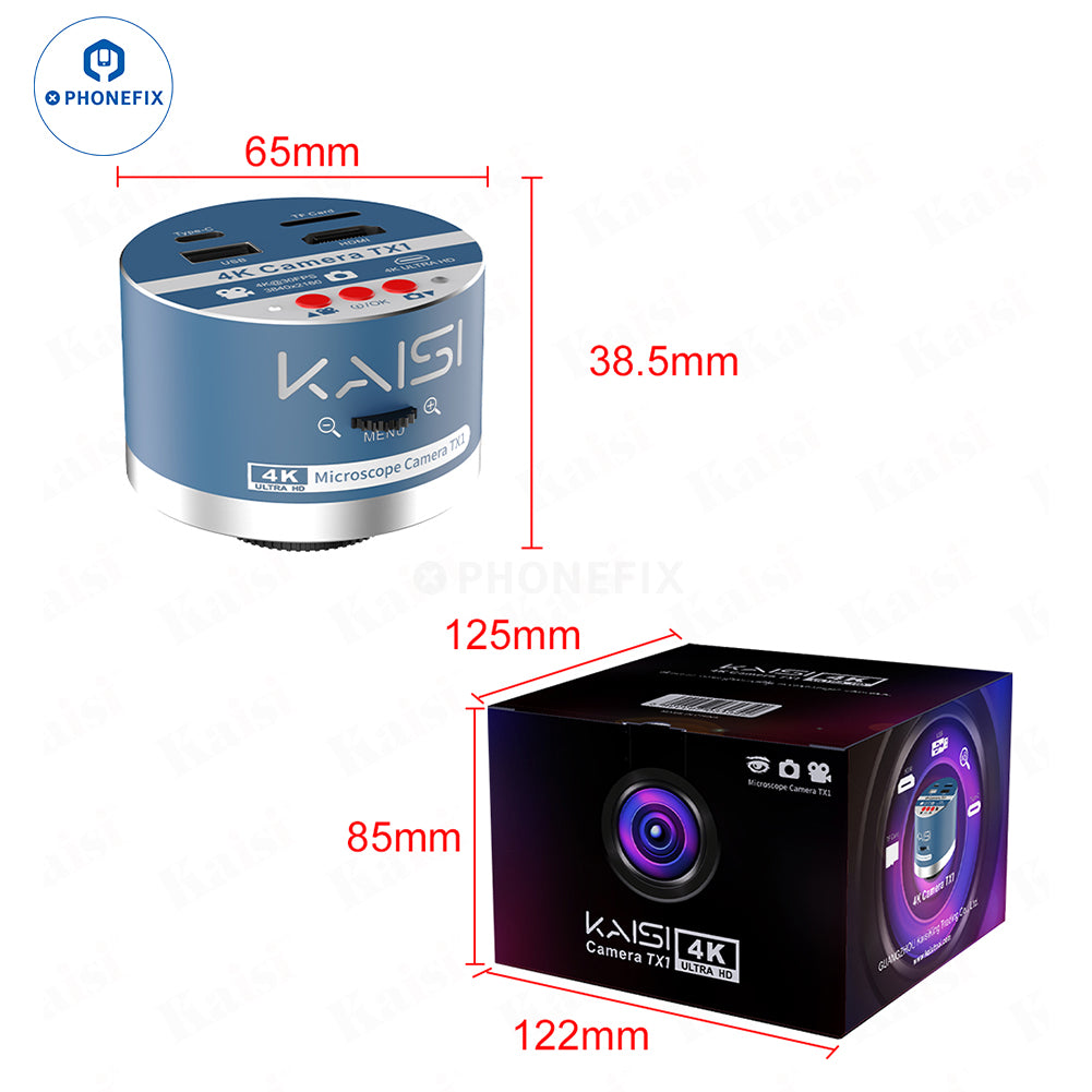 Kaisi TX1 4K HD industrial microscope camera dual interface synchronous output 4k HD camera. Kaisi 4k Microscope Camera can generate high-resolution images with bright natural colors for electronic PCB motherboard CPU IC observation welding repair. Kaisi TX1 4K HD microscope camera ultra-high-definition output high-resolution adjustable digital camera, for mobile phones and tablet computer repair tools.