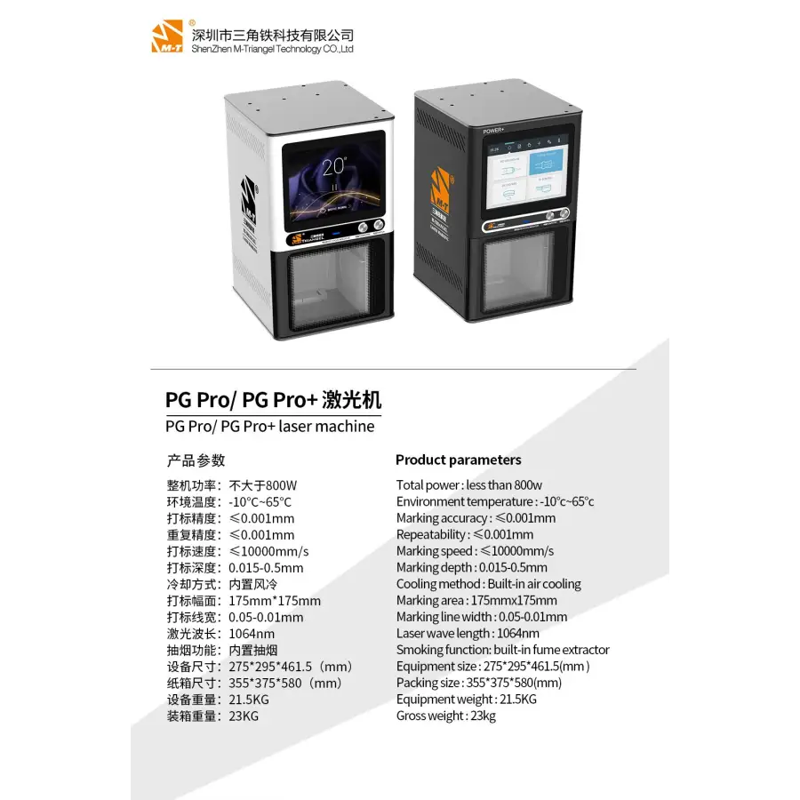 Features: 1. M-Triangel PG Pro laser power: 8W; 2. M-Triangel PG Pro+ POWER+ laser power: 20W 3. The latest laser machine, high safety, and environmental protection coefficient, built-in air cooling, and built-in smoking function. 4. With a large screen, M-Triangel PG Pro/ Pro+ features the WiFi, visual auto-focus fuction and built-in air filter. 5. High-quality fiber laser source, long working life. 6. Built-in computer and comes with laser software, easy to set up 7. Support for back glass separation: iPhone 8- 14 Pro Max 8. LCD middle frame separation: iPhone, Samsung, Xiaomi, Huawei, LG, OnePlus, VIVO, OPPO, etc. 9. Engraving a wide range of metal materials: stainless steel, copper, aluminum, chrome brass, credit card, etc. 10. Engraving non-metallic materials: silicon wafers, ceramics, plastics, rubber, epoxy resin, ABS, ink, electroplating, spraying, and coating. 11. Laser Machine for Mid frame, Bezel, Back glass Separate, Marking, Engraving.