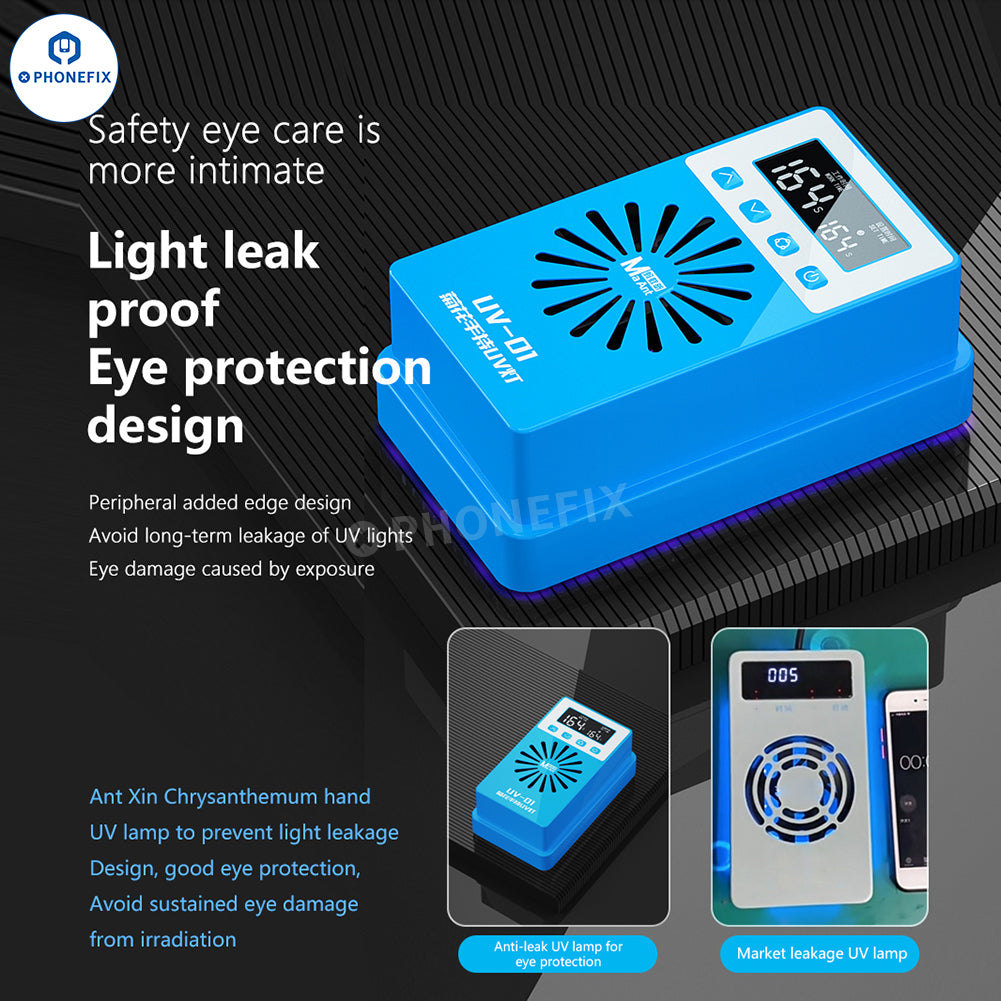 MaAnt UV-01 Handheld UV Curing Lamp 65W High Power Strong Heat Dissipation for all kinds of OCA dry glue, UV water glue, shadowless glue and light green oil. MaAnt MY-01 Smoke Exhaust UV Curing Light and Fast Cooling Fan 3 in 1 for mobile phone motherboard BGA chip repair.