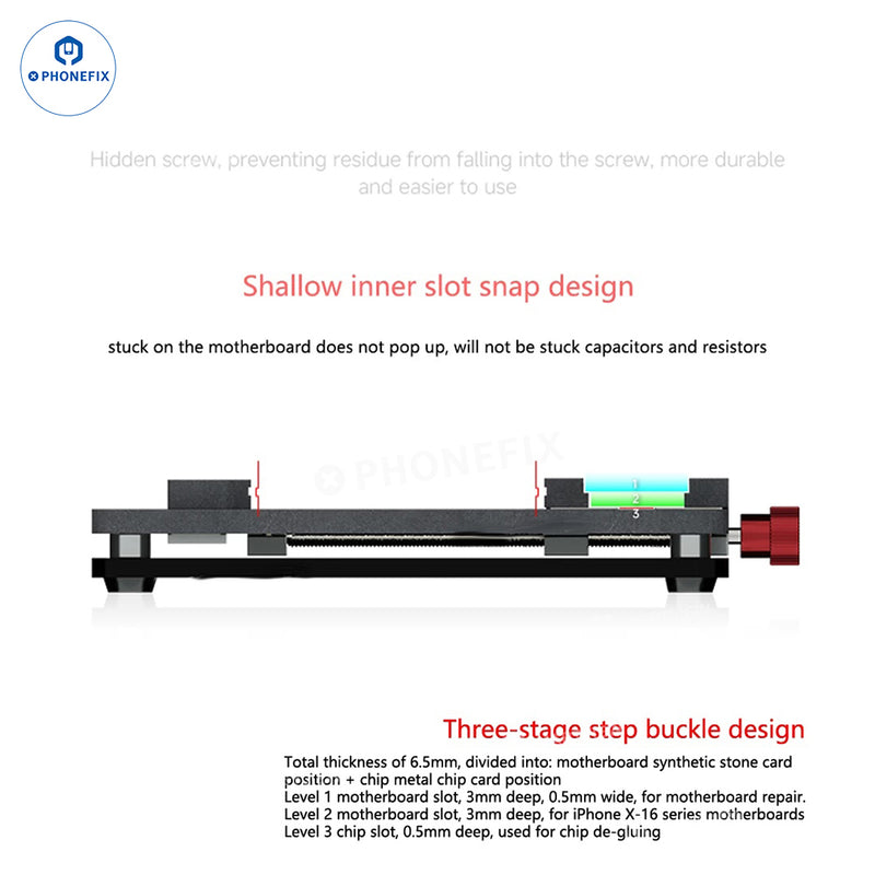 6. 1-level motherboard slot, 3mm deep, 0.5mm wide, for motherboard repair; 2-level motherboard slot, 3mm deep, suitable for iPhone X-16 series motherboard; 3-level chip slot, 0.5mm deep, for chip degumming.