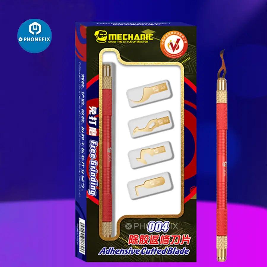 Mechanic 004 double-end glue cutting rework blades set with 4 kinds steel blades for mobile phone motherboard BGA chip layer, UV glue clean tool for removing residue adhesive glue form cell phone PCB BGA repair