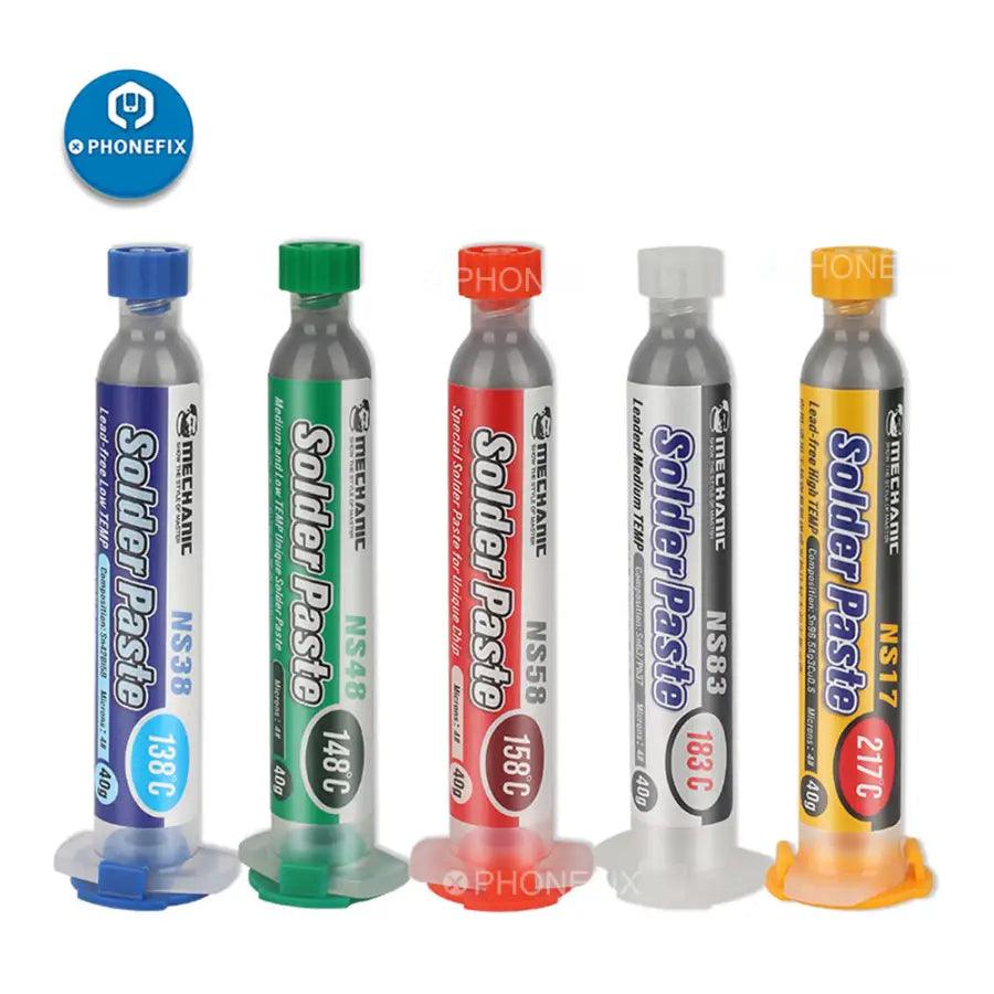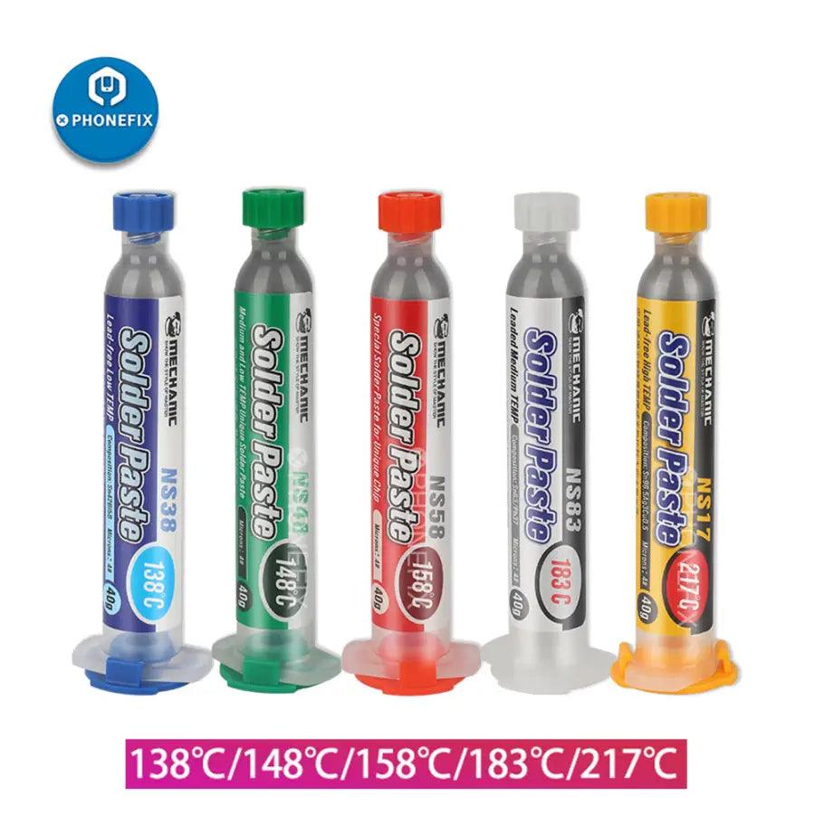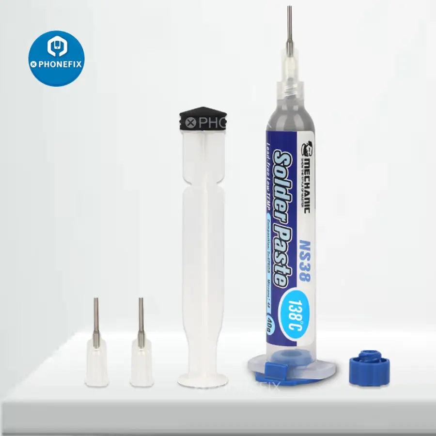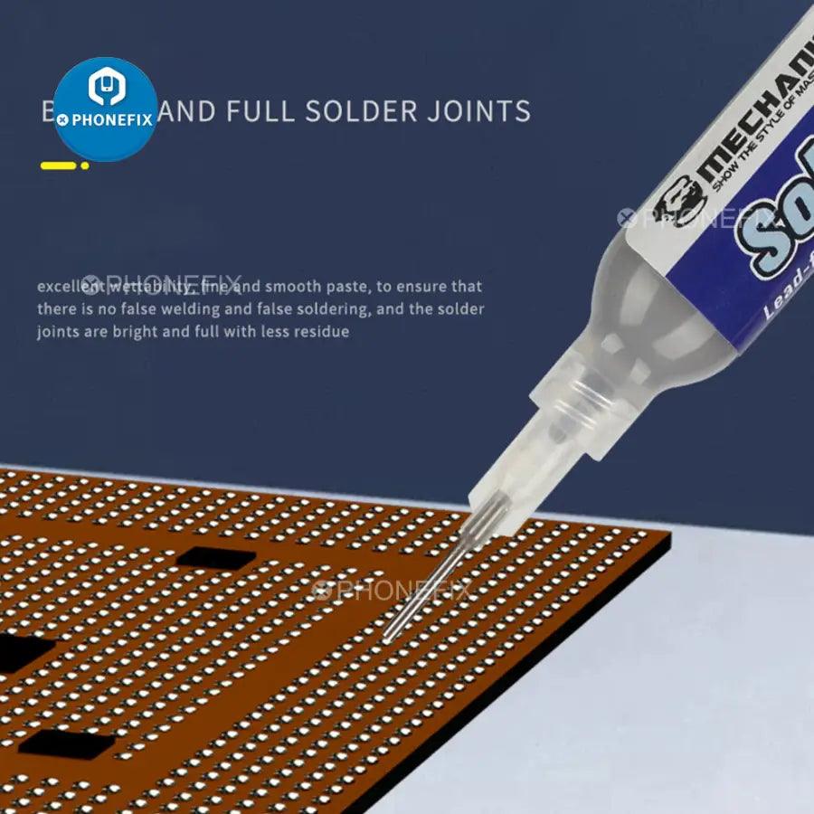 MECHANIC simple syringe-shape solder paste soldering cream for cell phone welding repair, Mechanic paste flux 10CC tin soldering Sn63/Pb37 with syringe and 3 needles for mobile phone SMT PCB repair, Mechanic soldering tin paste flux, Solder joint full, lead-free, environmental protection, strong adhesion.
