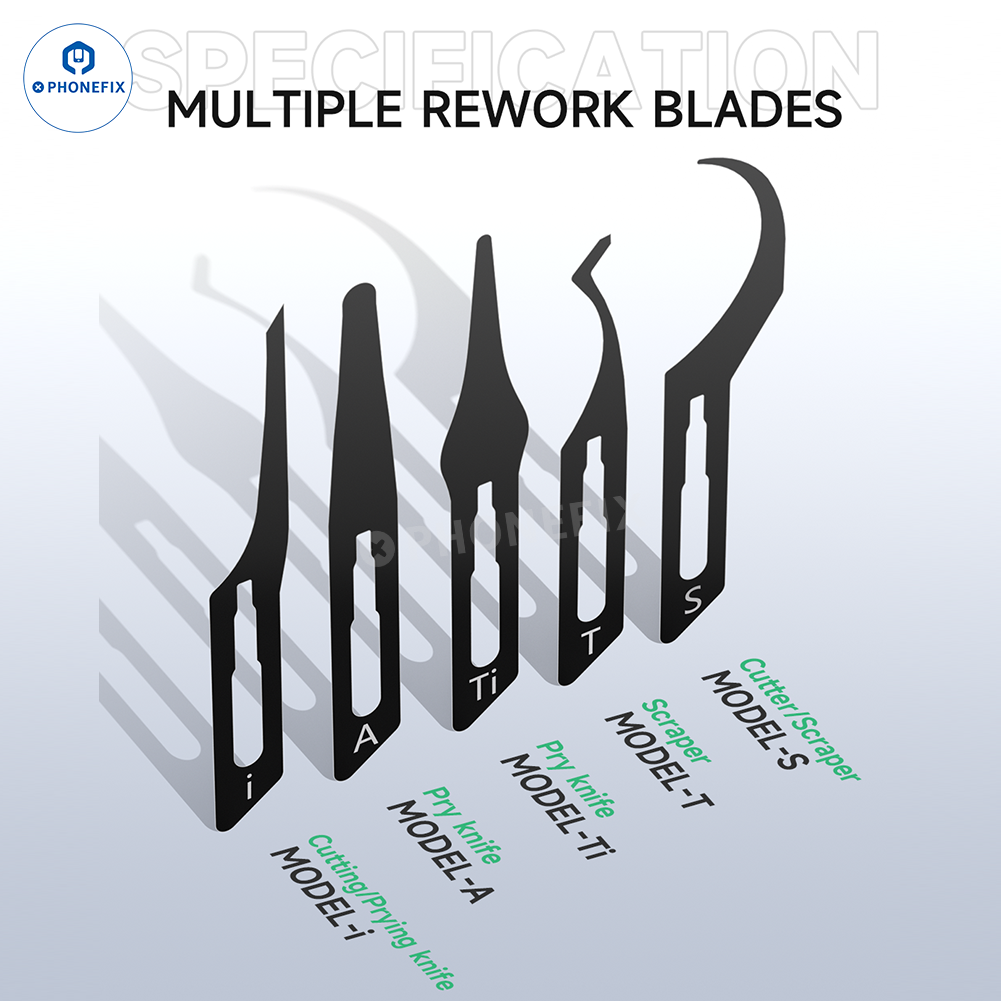 1. Multiple Specifications, Comprehensive Functionality: Includes five different blade models: Cutting/Scraping Blade MODEL-S, Scraping Blade MODEL-T, Prying Blade MODEL-Ti, Prying Blade MODEL-A, and Cutting/Prying Blade MODEL-i, covering a variety of rework tasks, including prying, glue removal, cutting, and delamination.