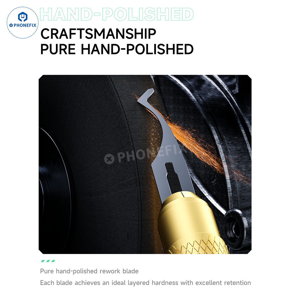 MECHANIC Assassin 5 Degumming Rework Blade Set and Mechanic ONE Green LED Knife Handle Kit for mobile phone motherboard CPU BGA IC prying, glue removal and repair. A high-quality knife handle with 5 different blades, suitable for repairing motherboard chips of mobile phones and tablets, cutting and removing glue, etc.