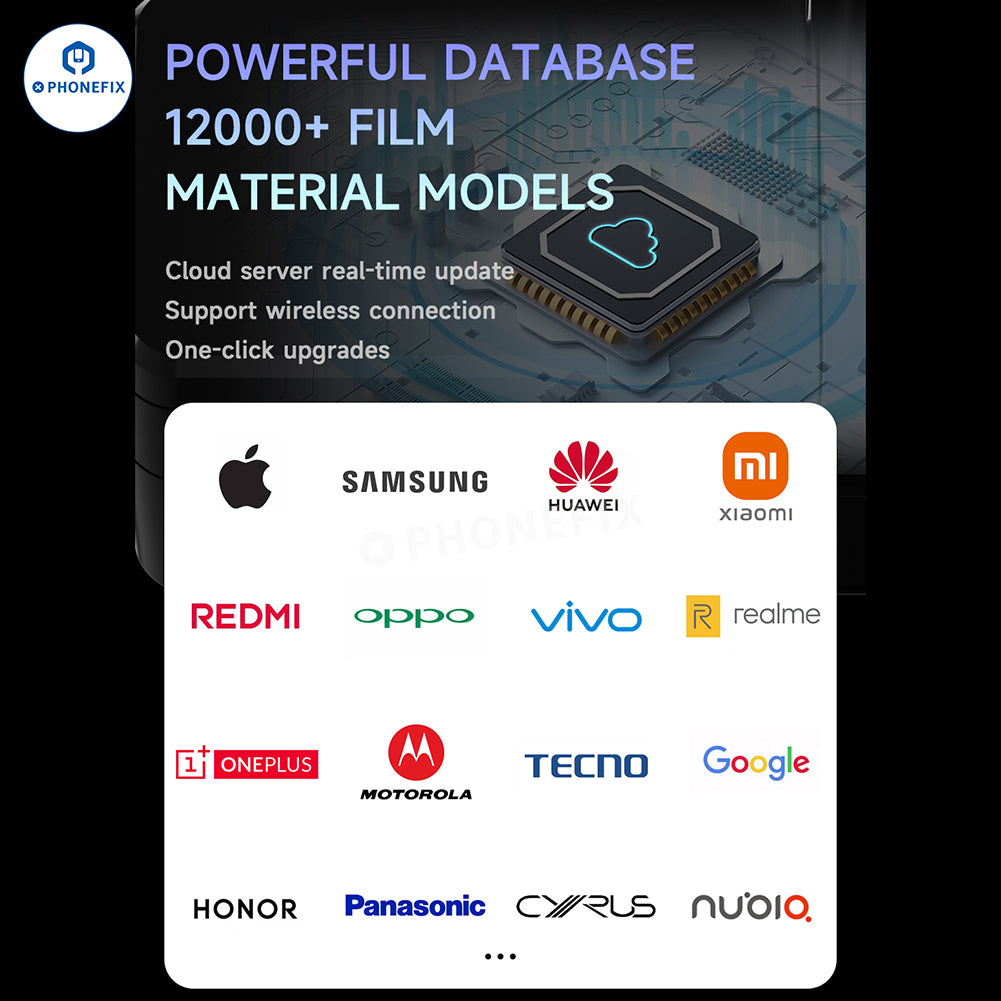 2. 0.1mm ultra-precision cutting, compatible with tablets up to 12.9 inches and mobile phone films as small as 129x61mm, support TPU film and UV film modes, with an industry-leading error rate. Support iPhone, Samsung, HUAWEI, Xiaomi, REDMI, OPPO, vivo, realme, ONEPLUS, MOTOROLA, TECNO, Google, HONOR, Panasonic, NUOIO.