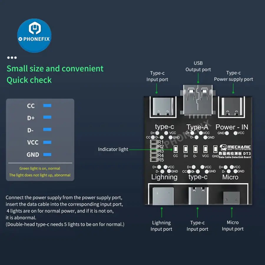 MECHANIC DT3 Data Cable Detection Board for IPhone Android USB Type C Light Lighing Datecable Short Circuit Checking Tool. Mechanic DT3 data cable On Off detection board for IOS lightning cable Android USB/Type-C/Micro cable.