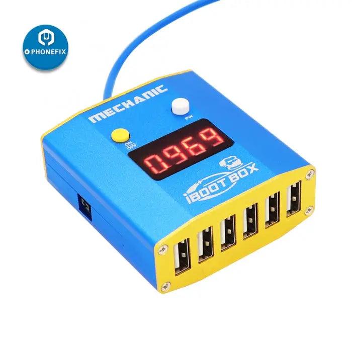 Mechanic iBoot box DC power supply cable for Android iPhone 6-13 Pro Max repair. Mechanic iBoot box is a revolutionary power supply cable for booting mobile phones motherboard, three kind of inputs power supply, all support for wide voltage DC 5V-28V input, 6 Port USB output, Four-digit display LED screen, the accurate current display.
